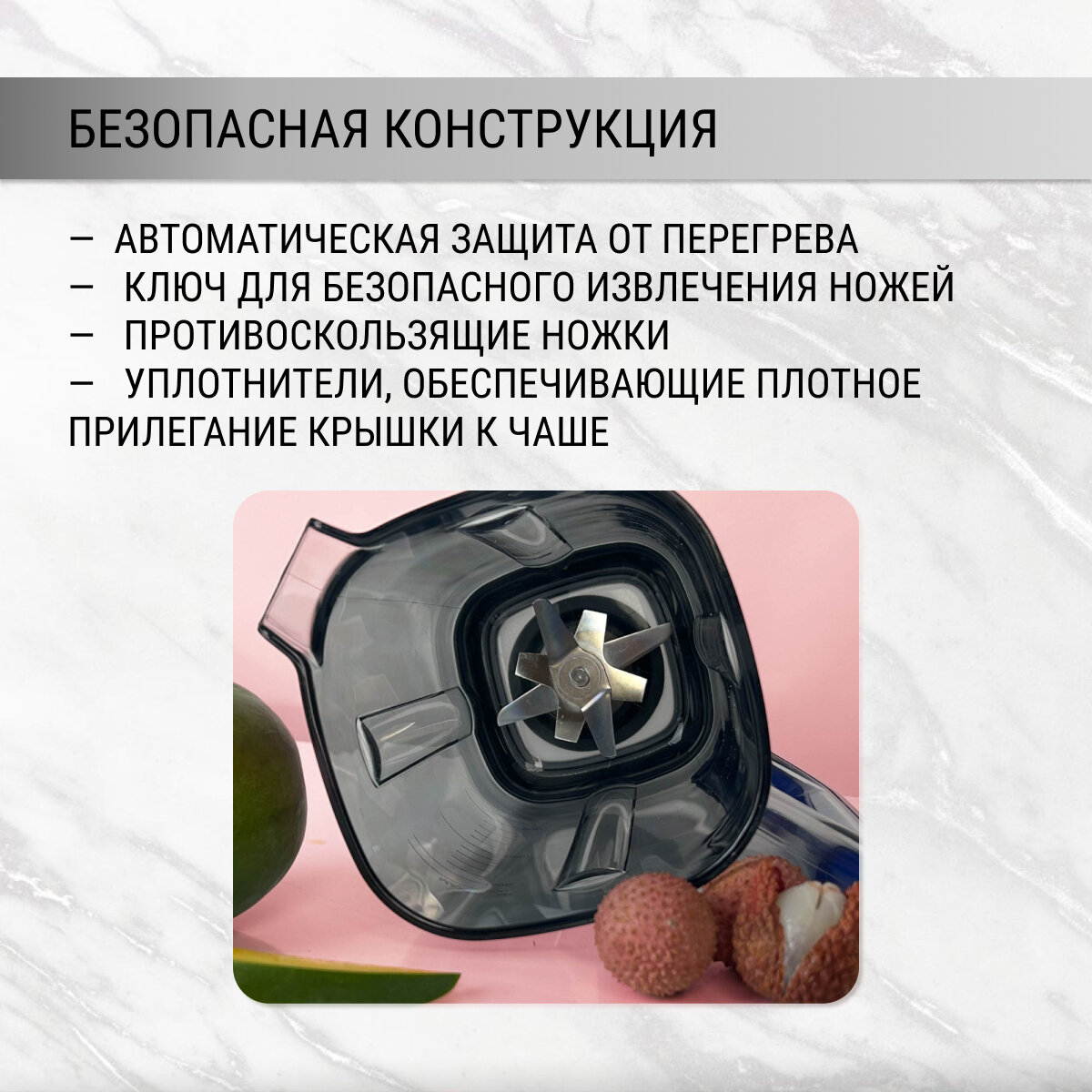 Блок с ножами тоже внушает доверие. Чаша из толстого пластика, крепкая, никаких посторонних запахов нет. Моется легко.