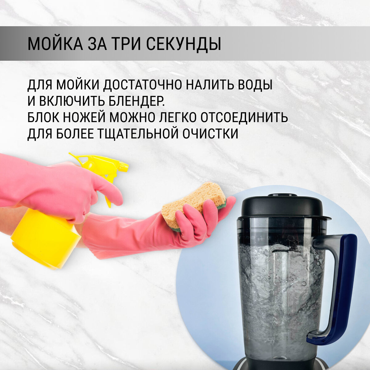 Помыть блендер очень просто. Ополоснуть и слить воду. Есть толкатель и крышка плотно закрывается. Ничего не выплескивается, хотя по вибрации на столе чувствуется вся его дикая мощь. В общем One Love!=)