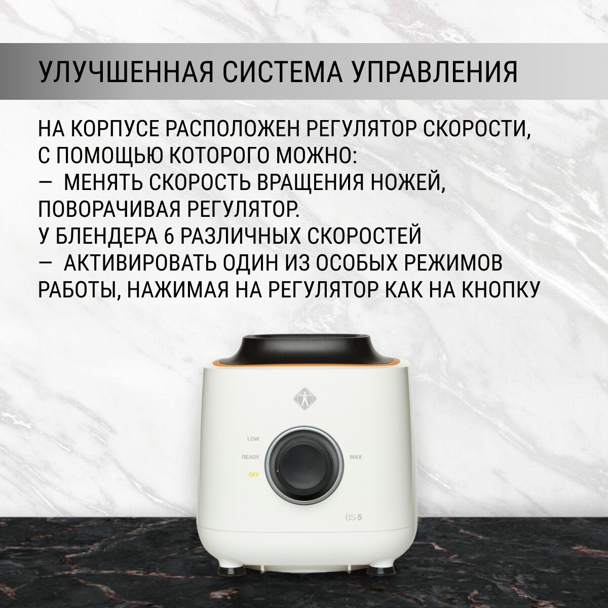 Система управления проста и удобна, всего одна кнопка со светодиодными индикаторами регулирует скорости блендера, а так же позволяет осуществлять функцию импульсного режима.