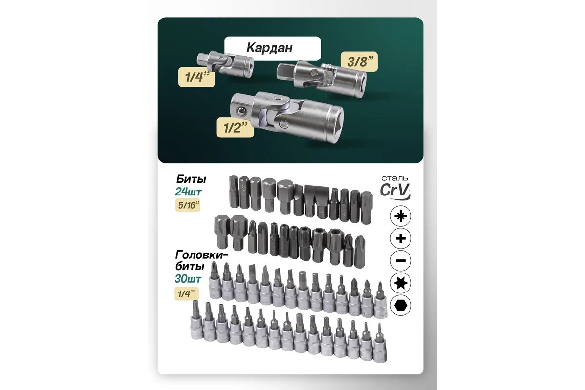 | Головки торцевые подробно | 1/4": 4, 4.5, 5, 5.5, 6, 7, 8, 9, 10, 11, 12, 13, 14 мм; длинные 1/4": 4, 5, 6, 7, 8, 9, 10 мм; Torx 1/4": E4, E5, E6, E7, E8; с… битами 1/4": H3, H4, H5, H6, T8, T9, T10, T15, T20, T25, T27, T30, T8H, T9H, T10H, T15H, T20H, T25H, T27H, T30H, SL4, SL5.5, SL6.5, SL7, PH0, PH1, PH2, PZ0, PZ1, PZ2; трещотка 1/4"; вороток т-образный 1/4"; удлинитель 1/4": 50, 100 мм; карданный шарнир 1/4"; 3/8": 10, 11, 12, 13, 14, 15, 16, 17, 18, 19 мм; длинные 3/8": 10, 11, 12, 13, 14, 15 мм; Torx 3/8": E10, E11, E12, E14, E16, E18, E20, E24; свечная 3/8": 18 мм; трещотка 3/8"; удлинитель 3/8": 125 мм; карданный шарнир 3/8"; 1/2": 10, 11, 12, 13, 14, 15, 16, 17, 18, 19, 20, 21, 22, 24, 27, 30, 32 мм; длинные 1/2": 16, 18, 22 мм; ударные 1/2": 17, 19 мм; свечные 1/2": 16, 1 мм; трещотка 1/2"; удлинитель 1/2": 125, 250 мм; карданный шарнир 1/2" ещёскрыть |