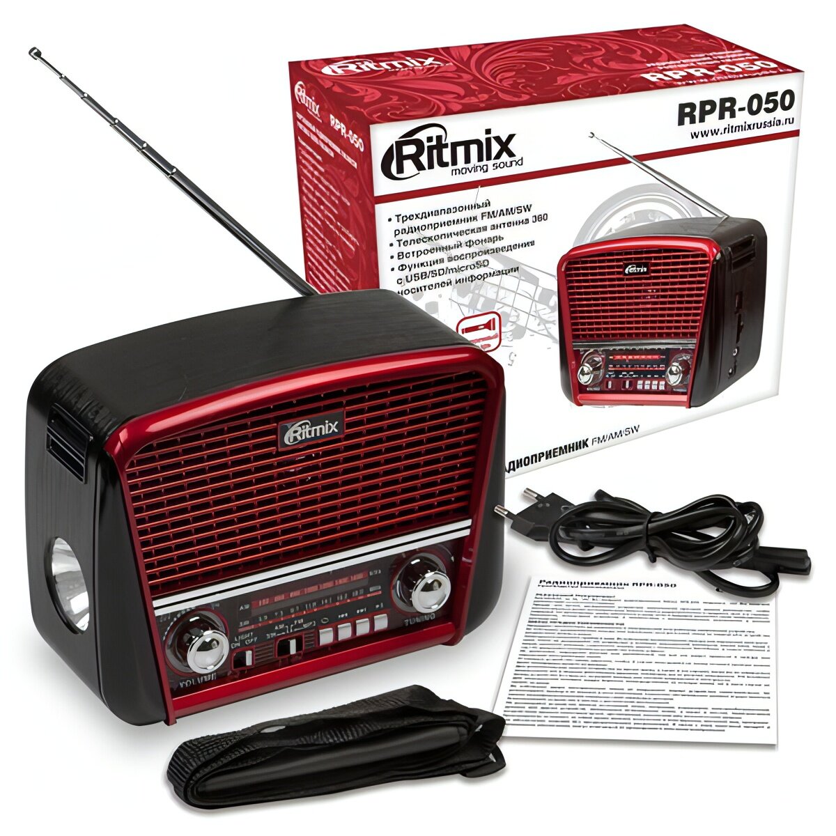 RITMIX Радиоприемник Ritmix RPR-050 RED, функция MP3-плеера, фонарь, красный