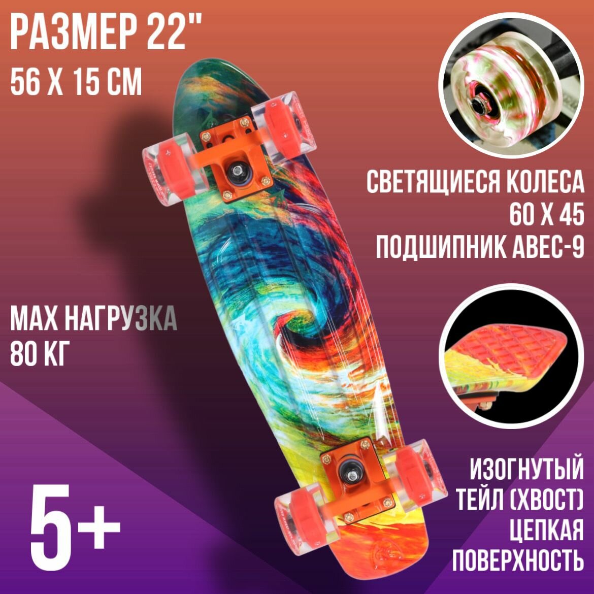 Скейтборд пластиковый (пенни борд) для детей и взрослых с принтом и светящимися колесами Triumf Active Firewave (огненная волна) 22 дюйма