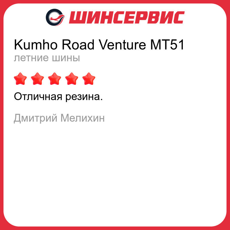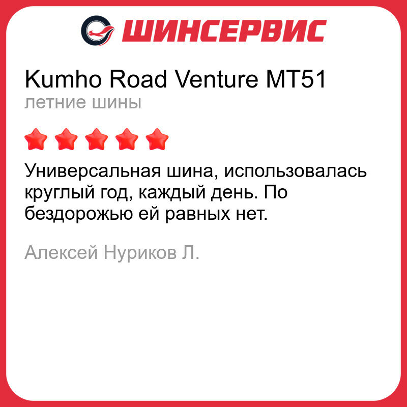 Ниже Вы можете прочитать отзывы на Шина Kumho(Кумхо) Road Venture MT51 245/70 R16 118/115Q летняя, ознакомится с подробными характеристиками, посмотреть интересные обзоры и фотографии на Шина Kumho(Кумхо) Road Venture MT51 245/70 R16 118/115Q летняя.