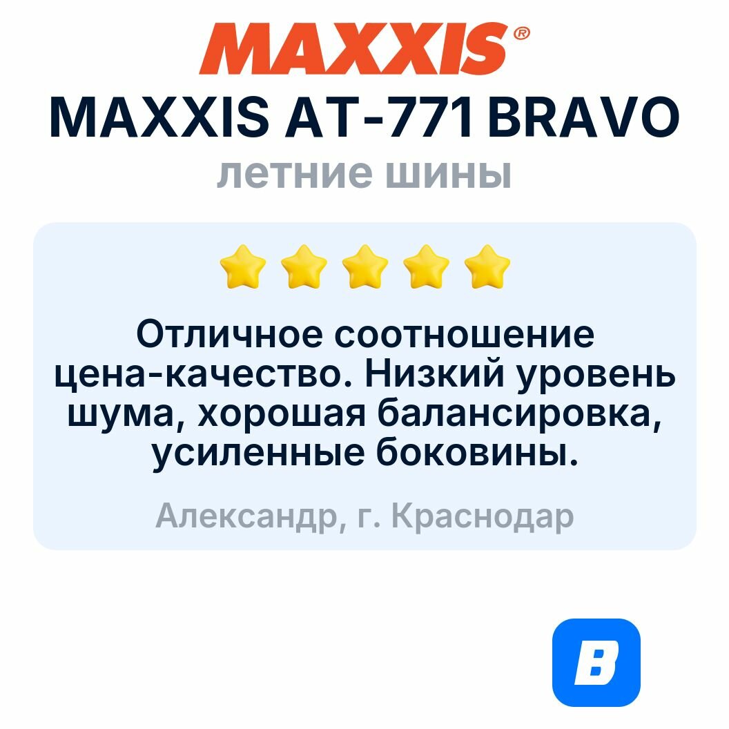 Ниже Вы можете прочитать отзывы на Летняя шина Maxxis AT-771 Bravo (225/75 R16 108S), ознакомится с подробными характеристиками, посмотреть интересные обзоры и фотографии на Летняя шина Maxxis AT-771 Bravo (225/75 R16 108S).