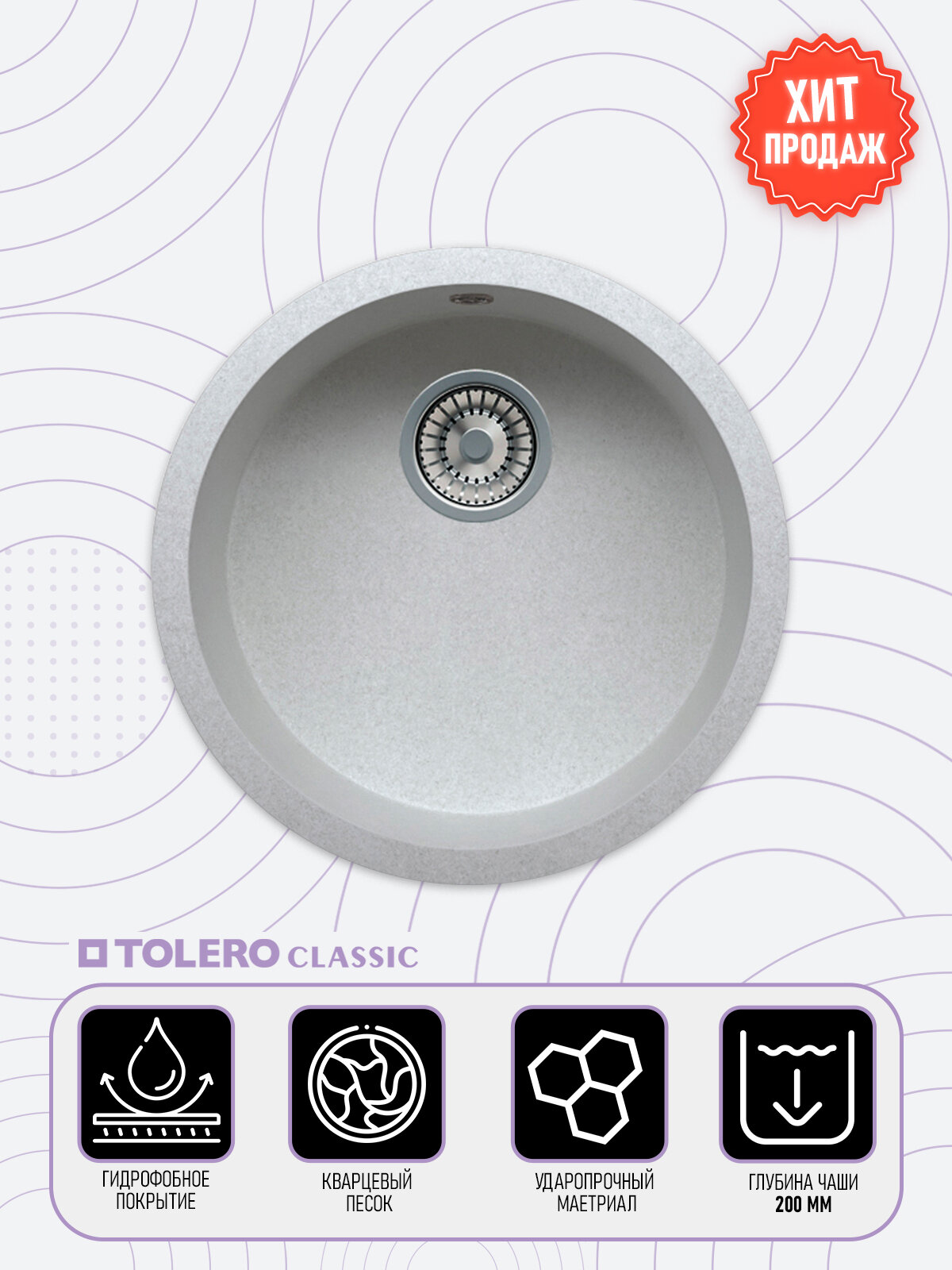 Мойка для кухни TOLERO Classic R-104 круглая каменная Кварц с возможностью нижней подклейки (№923 Белый)