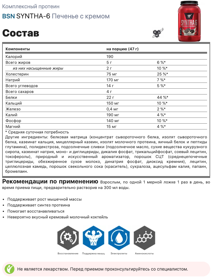 СохранитьКомплексный протеин BSN SYNTHA-6 1320 г, Печенье с кремом интересное: