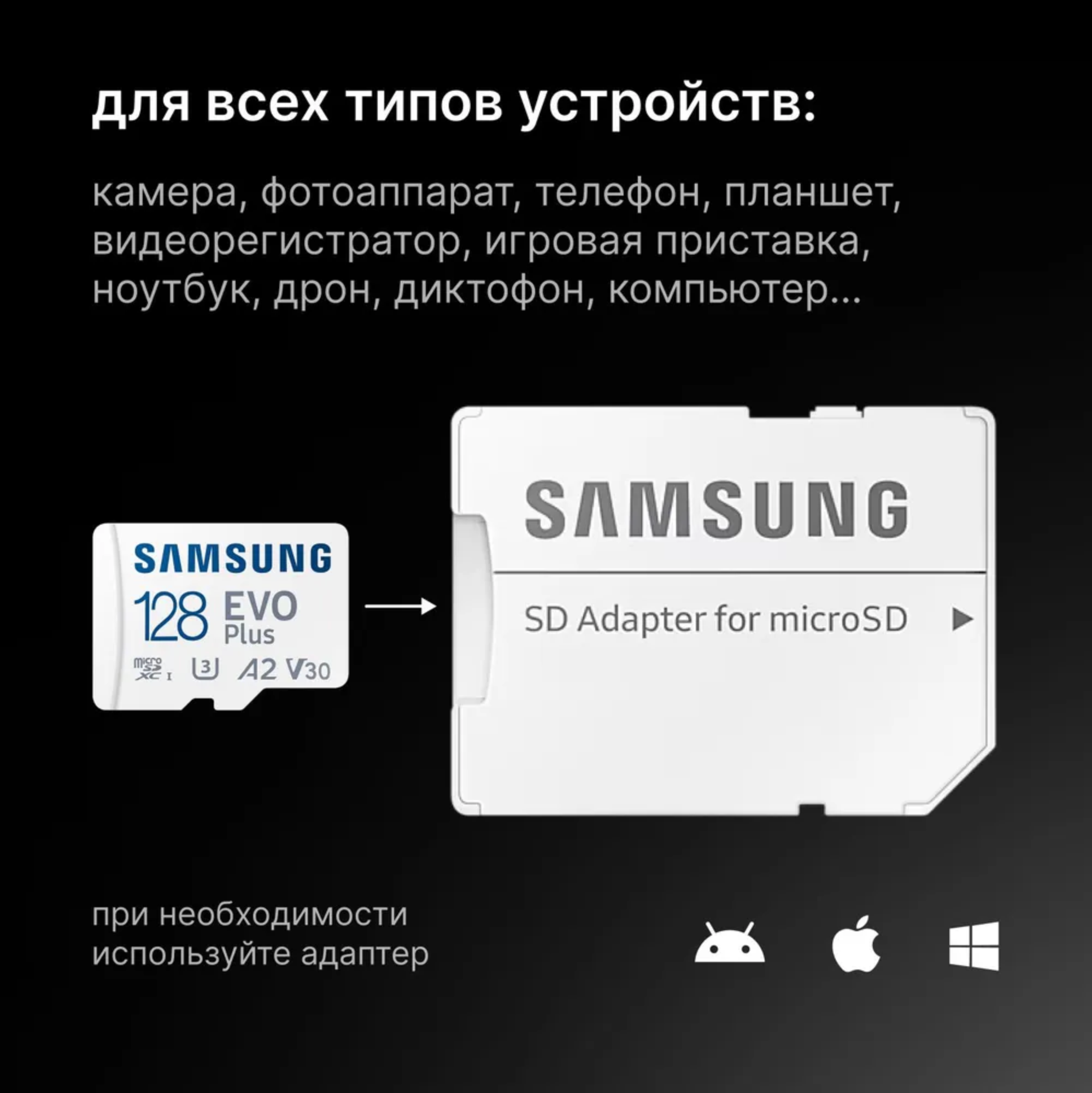 Карта памяти Samsung EVO Plus 128GB micro SDXC UHS-I класс 10 U3 A2 V30 4K UltraHD + SD Адаптер