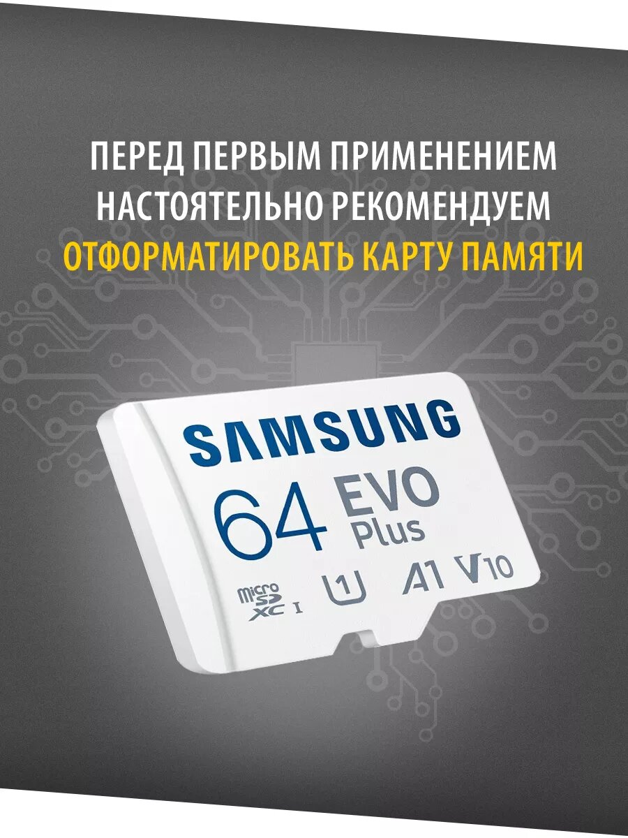 Карта памяти Samsung EVO Plus microSDXC 64 ГБ Class 10, V10, A1, UHS-I U1, R 130 МБ/с, адаптер на SD