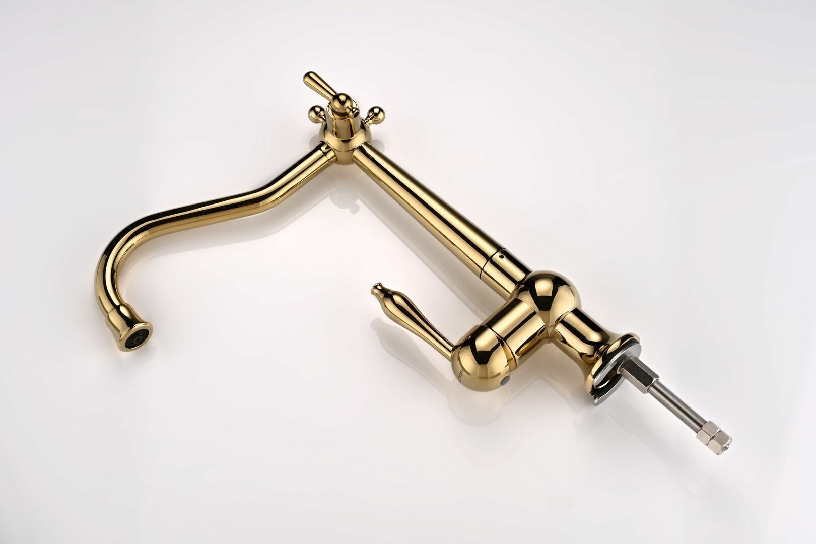 СохранитьСмеситель для кухни с подключением к фильтру питьевой воды Paulmark RETRO, высокий поворотный излив ретро дизайна из латуни, двурычажный, для мойки / столешницы, золото, Re213226-G интересное: