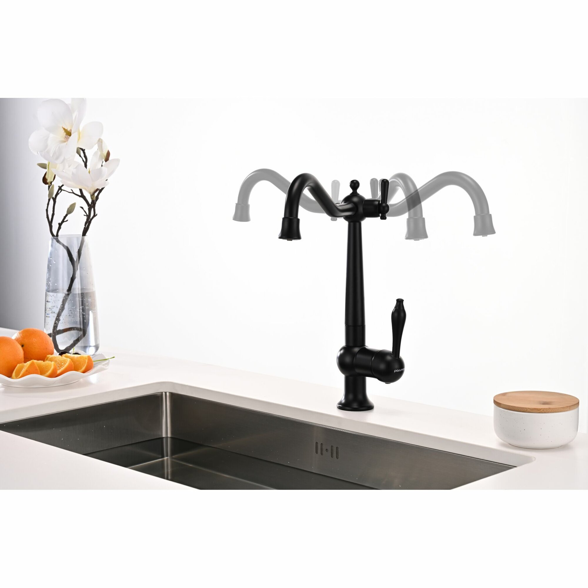 Смеситель для кухни с подключением к фильтру питьевой воды Paulmark RETRO, высокий поворотный излив ретро дизайна из латуни, двурычажный, для мойки / столешницы, бронза, Re213226-BR