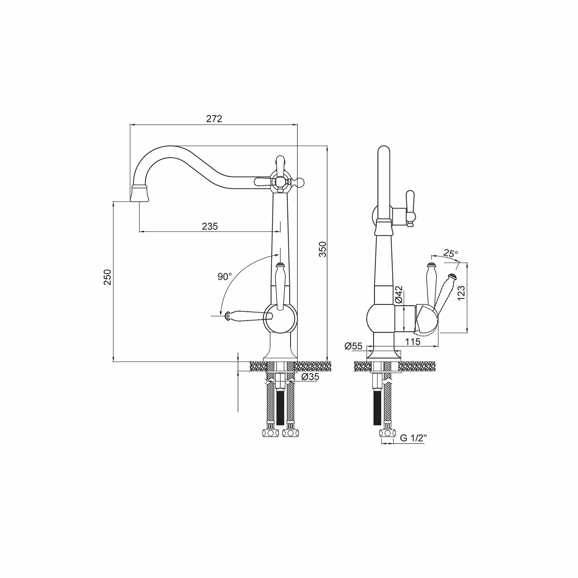 Смеситель для кухни с подключением к фильтру питьевой воды Paulmark RETRO, высокий поворотный излив ретро дизайна из латуни, двурычажный, для мойки / столешницы, хром, Re213226-CR