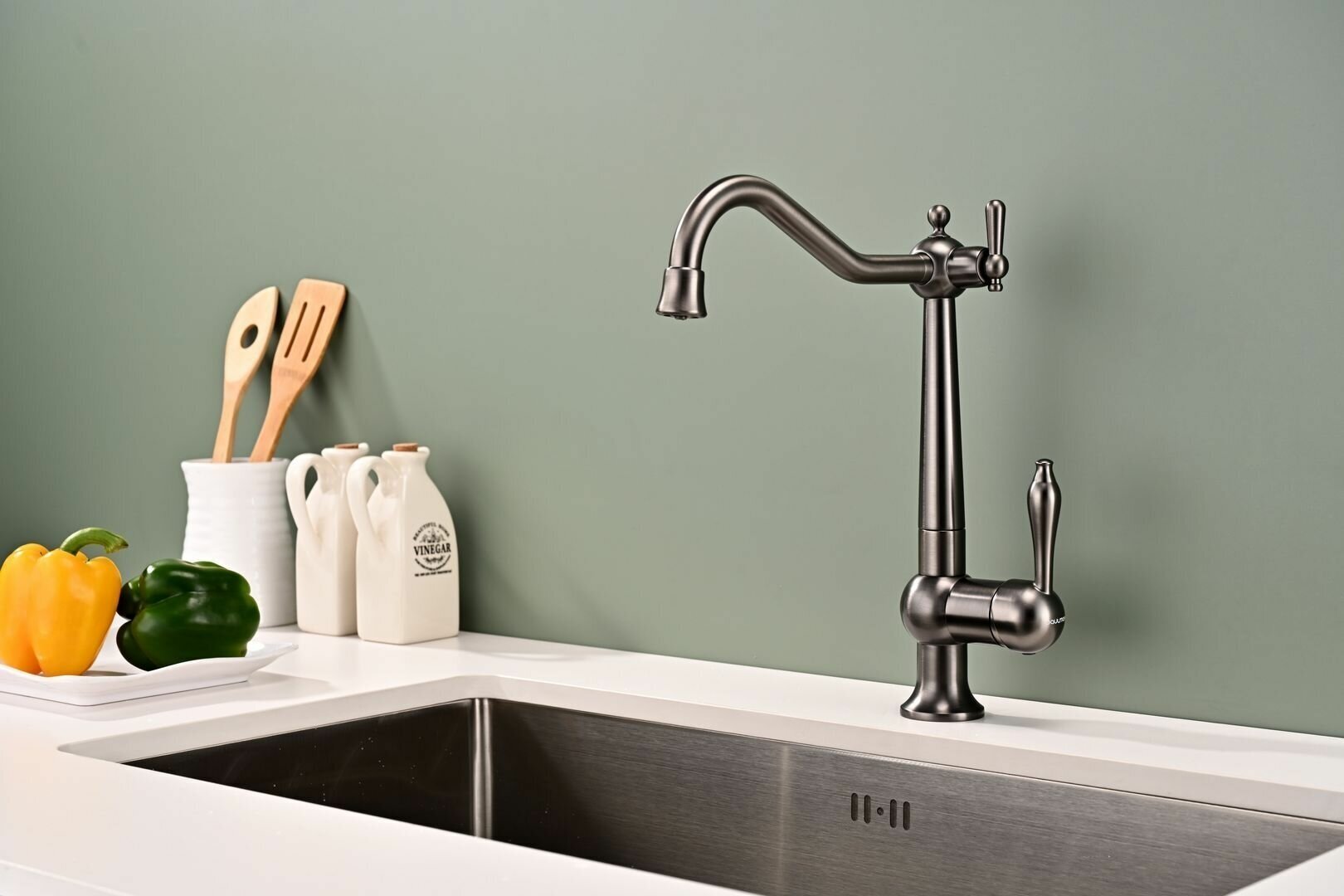 СохранитьСмеситель для кухни с подключением к фильтру питьевой воды Paulmark RETRO, высокий поворотный излив ретро дизайна из латуни, двурычажный, для мойки / столешницы, вороненая сталь, Re213226-GM интересное: