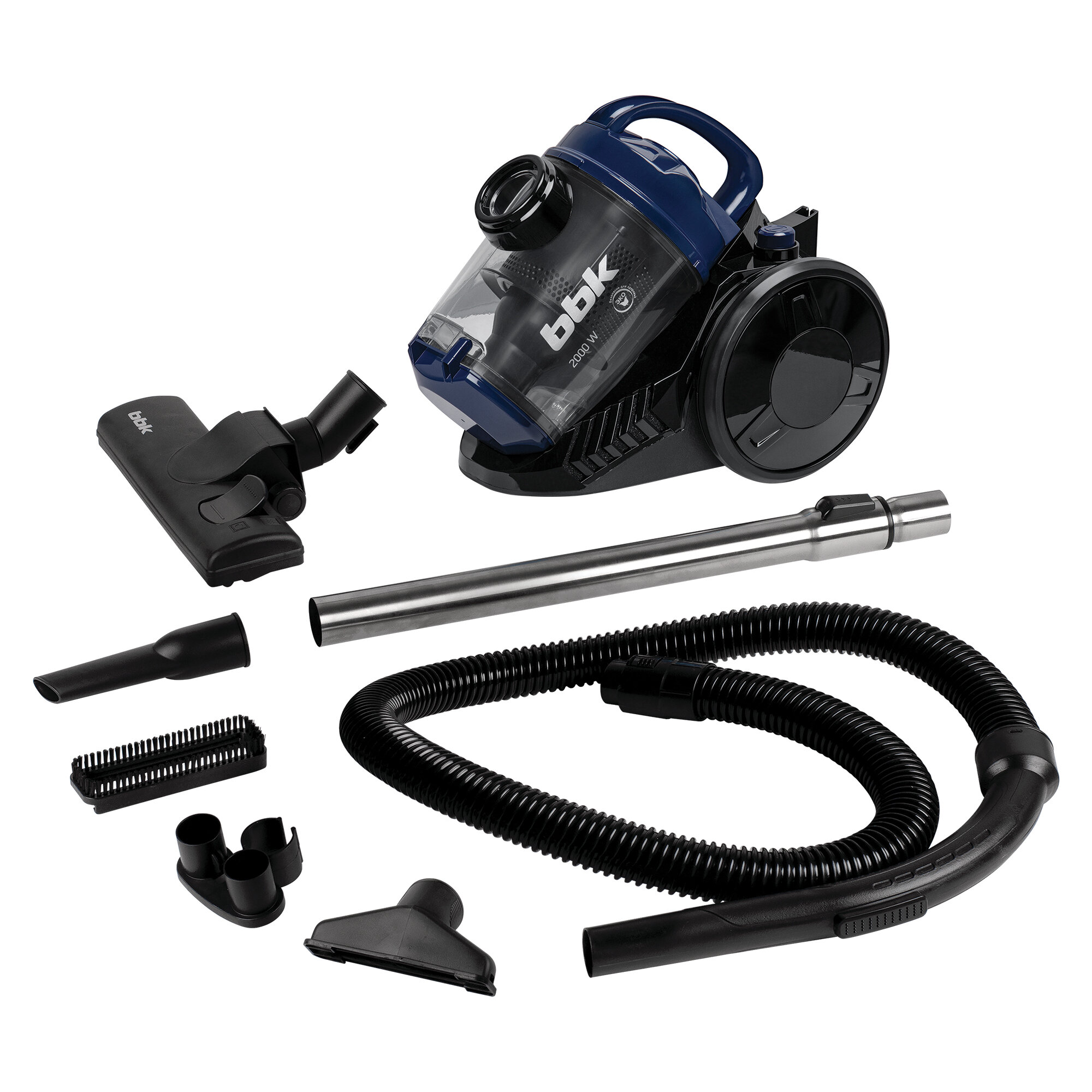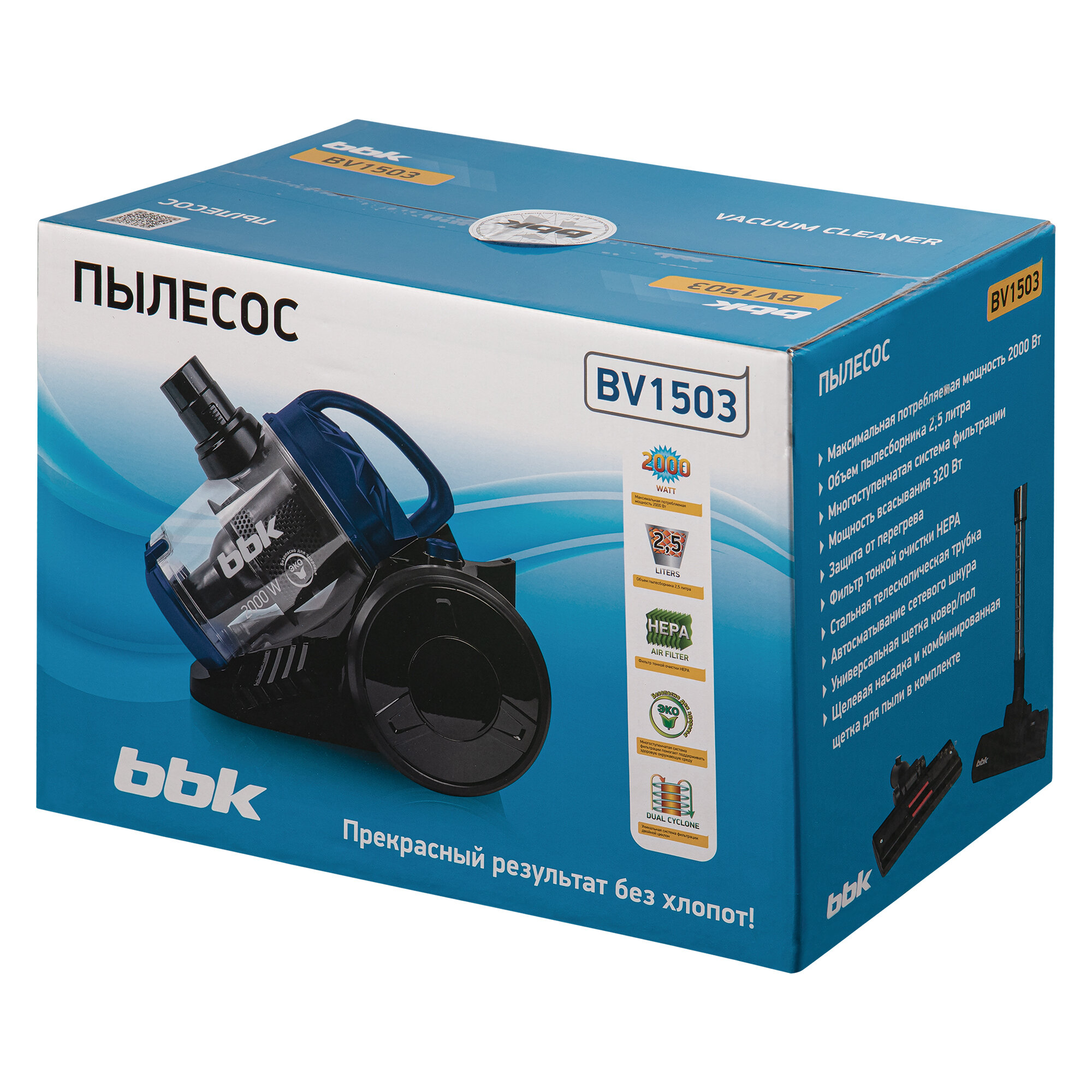 Купить Пылесос циклонный BBK BV1503 черный/синий, мощность 2000 Вт, нера фильтр, мощность всасывания 320 Вт, объем пылесборника 2.5 л, 3 насадки в комплекте