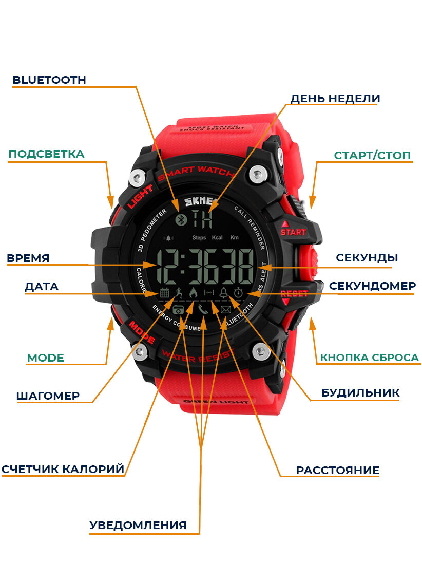 Часы наручные электронные спортивные мужские SKMEI кварцевые, с шагомером, секундомером и подсветкой, черные/красные