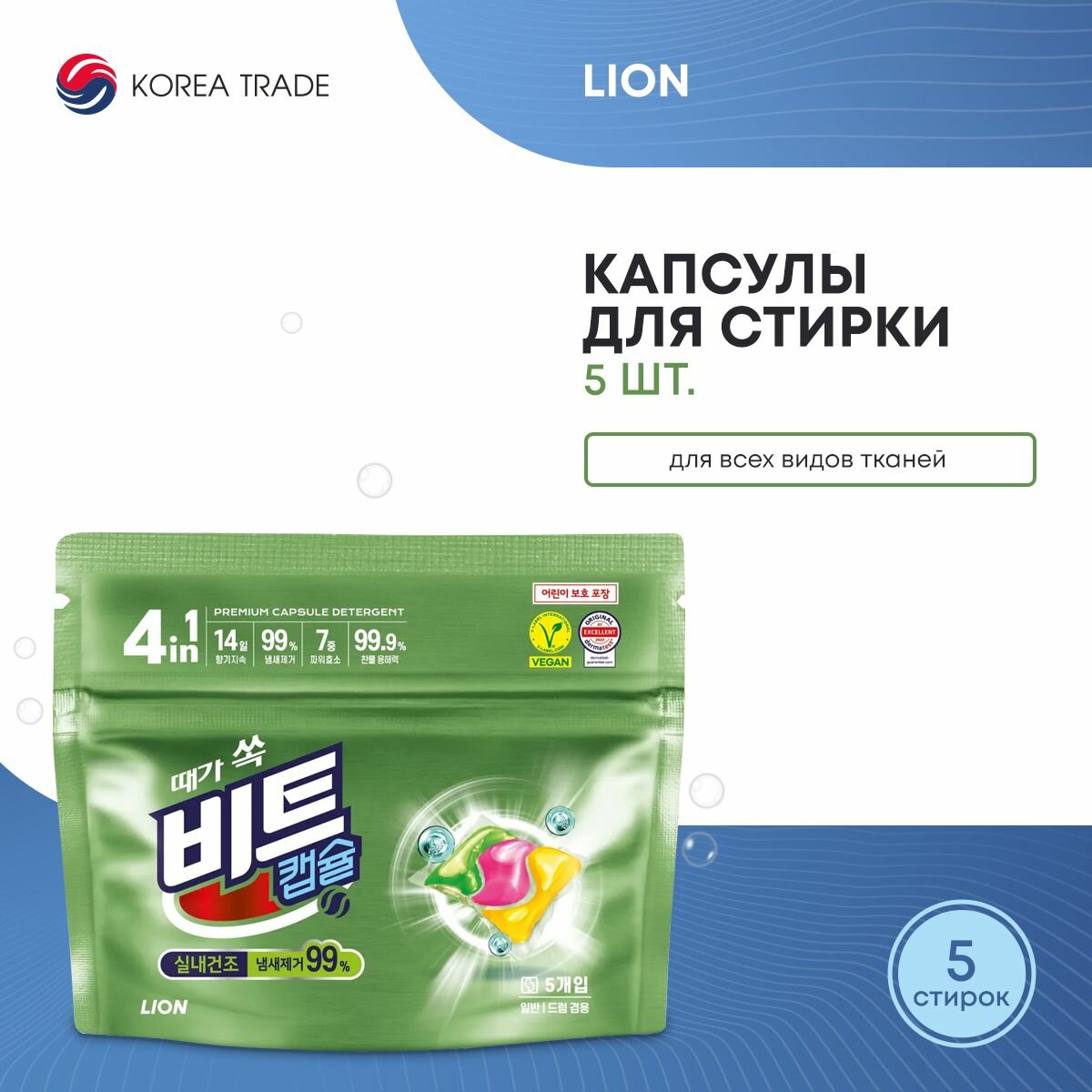 Купить LION Beat Capsule Detergent (indoor) Средство для стирки жидкое в капсулах 5шт