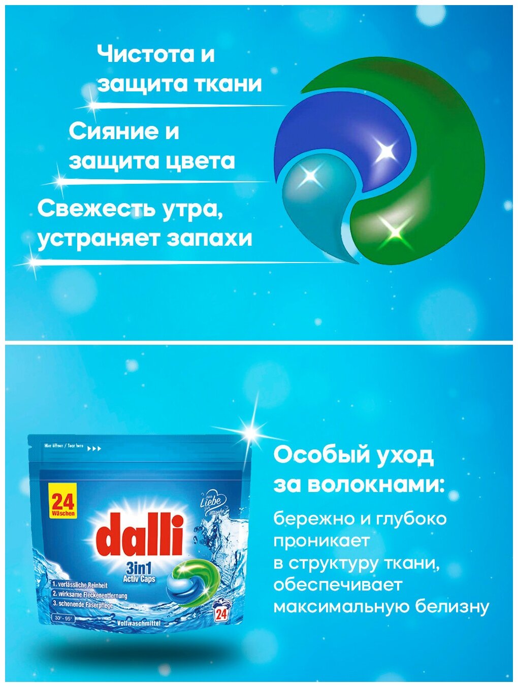 Dalli 3 in 1 Sport + Outdoor Caps Капсулы для стирки спортивной и туристической одежды 24 шт