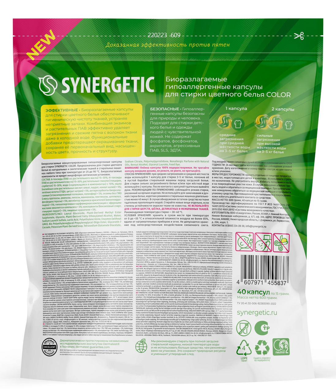 Биоразлагаемые концентрированные гипоаллергенные капсулы для стирки SYNERGETIC COLOR (60 штук)