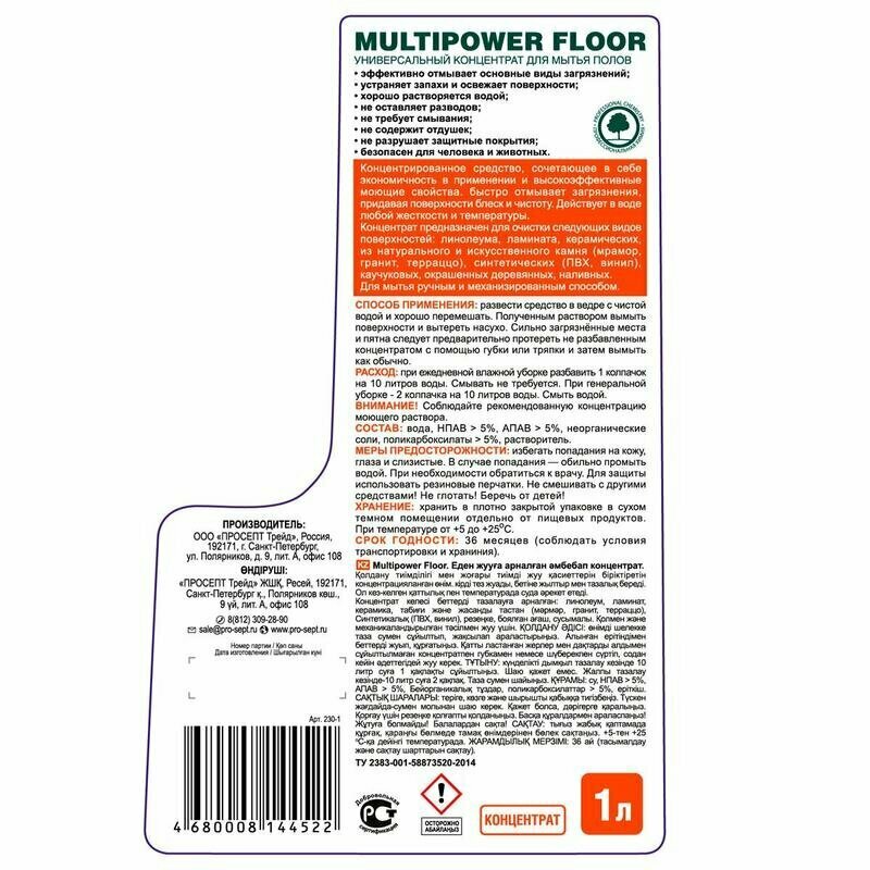 Средство для мытья пола Prosept Multipower FLOOR универсальный конц 1л , 1 шт.