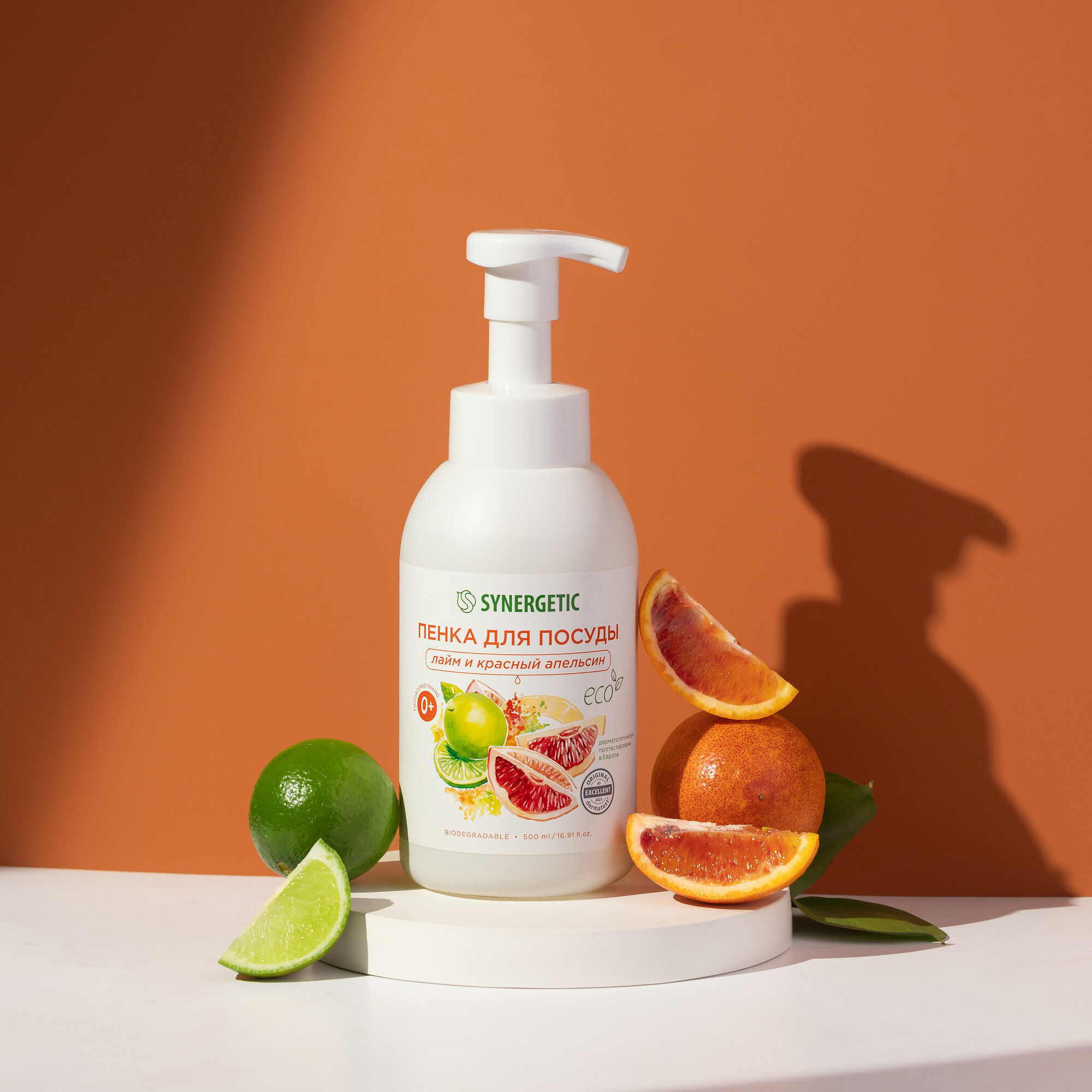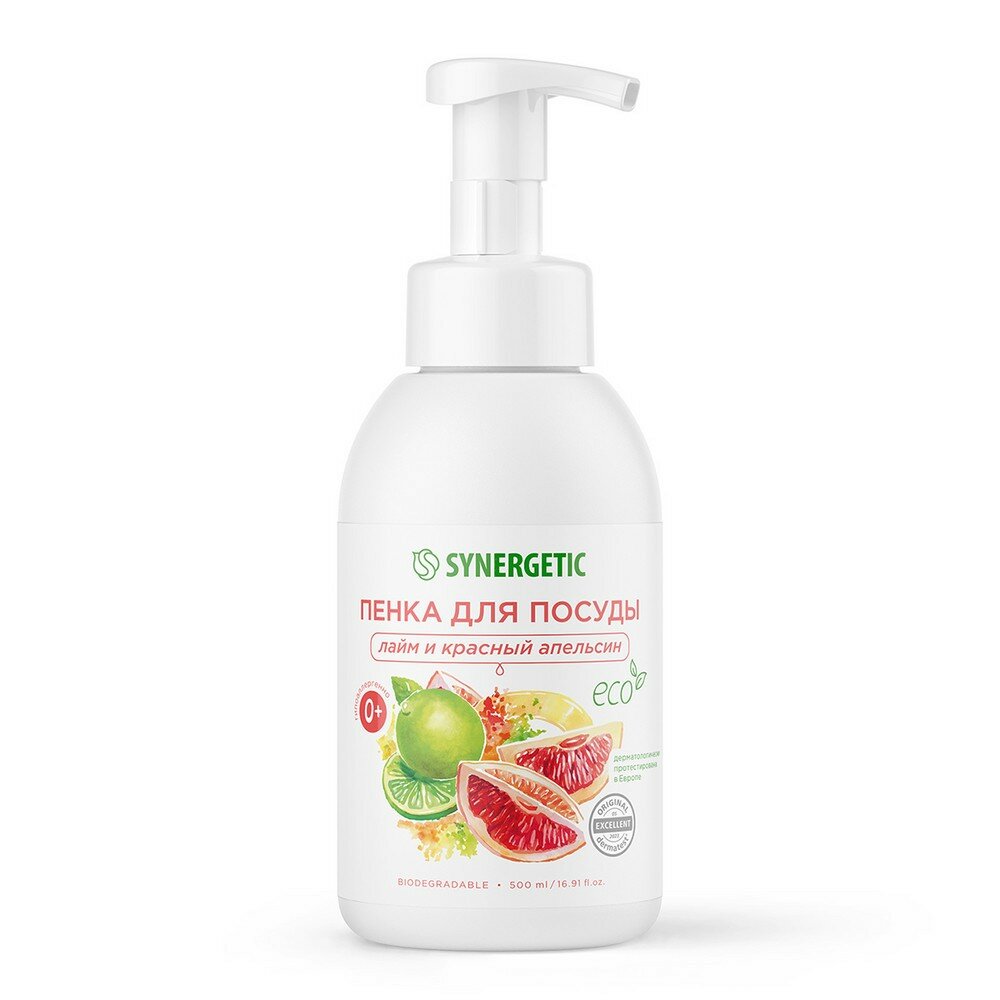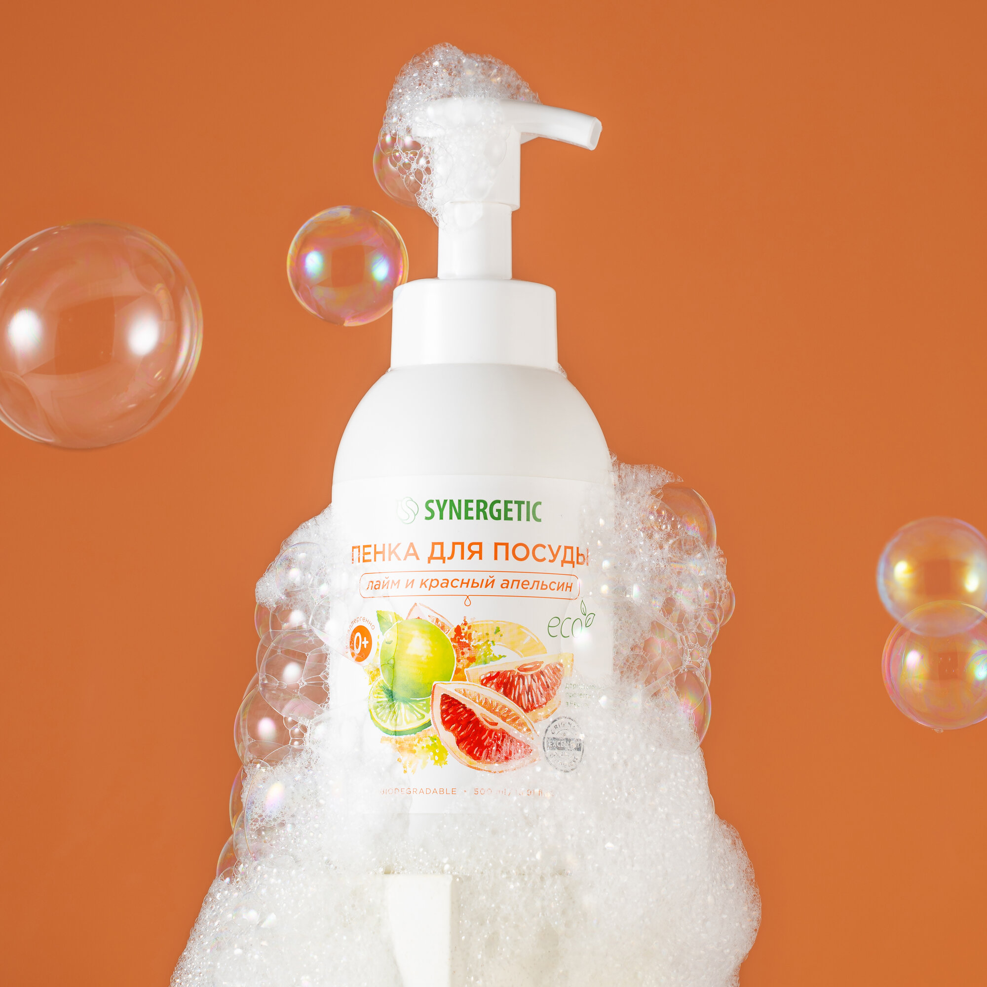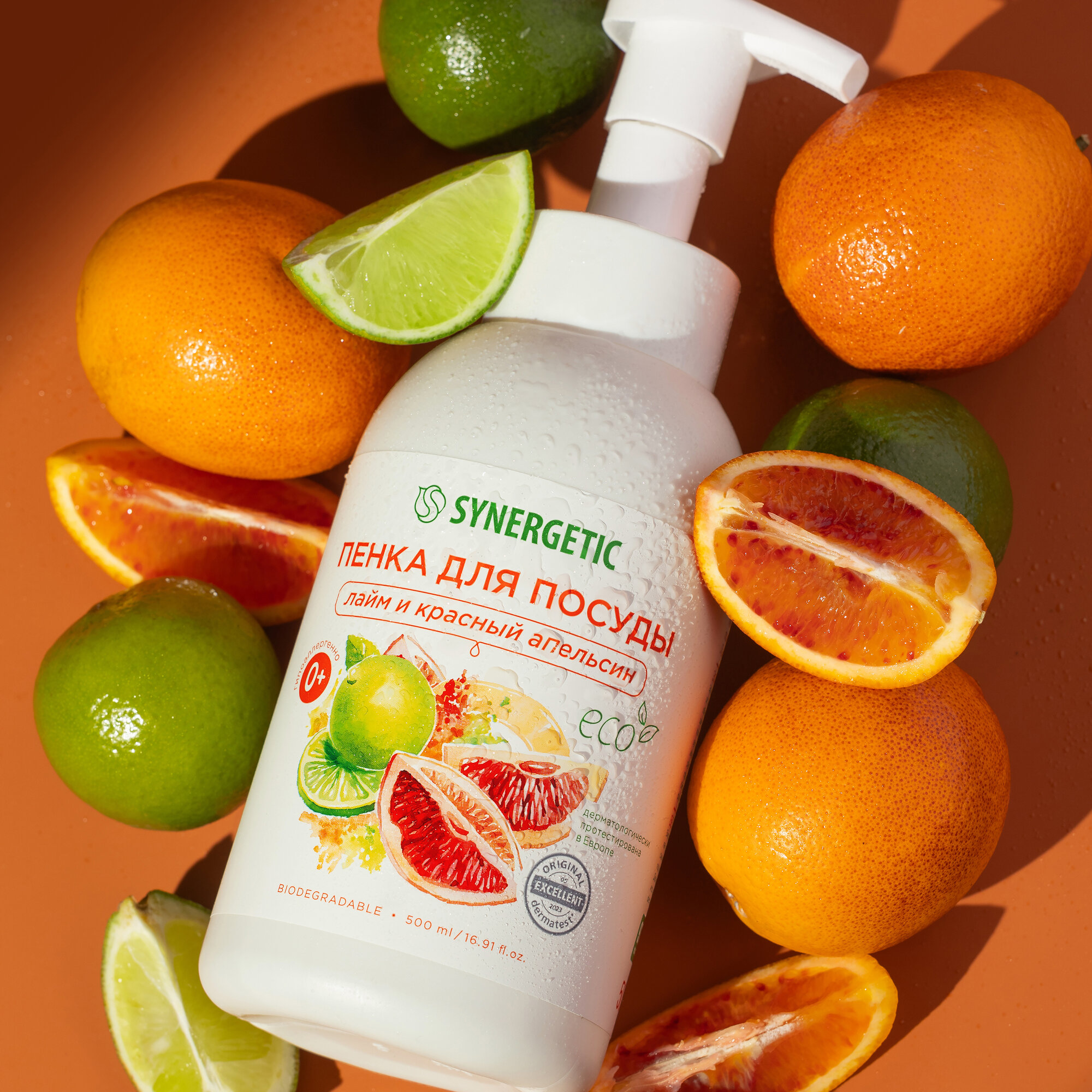 Купить Биоразлагаемая гипоаллергенная пенка для мытья посуды, детской посуды и игрушек SYNERGETIC Лайм и красный апельсин, 500 мл