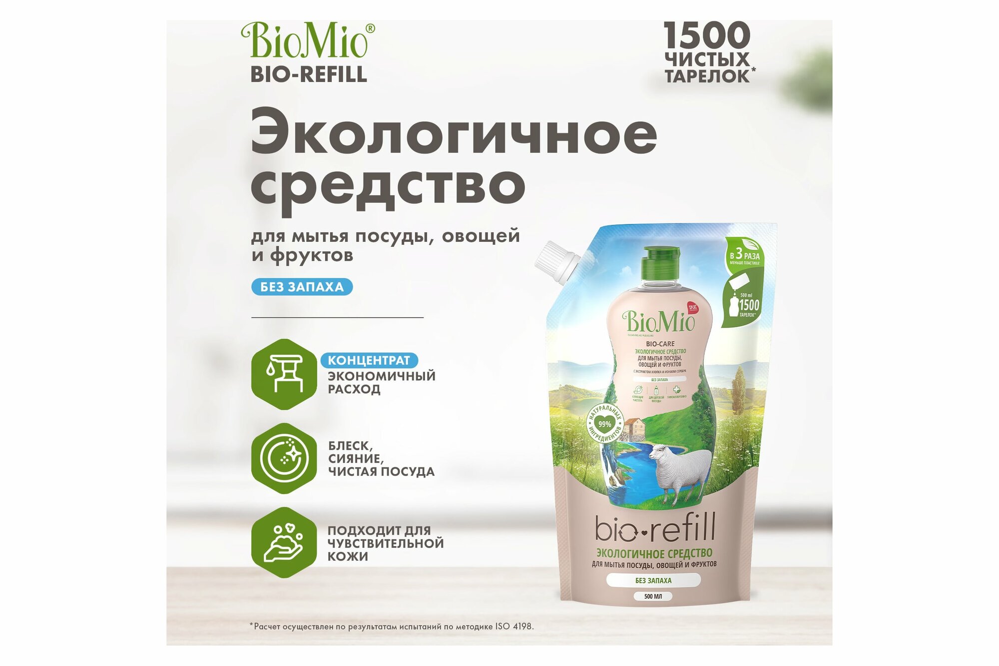 Средство для мытья посуды BioMio BIO-CARE Refill без запаха, 500 мл дой-пак
