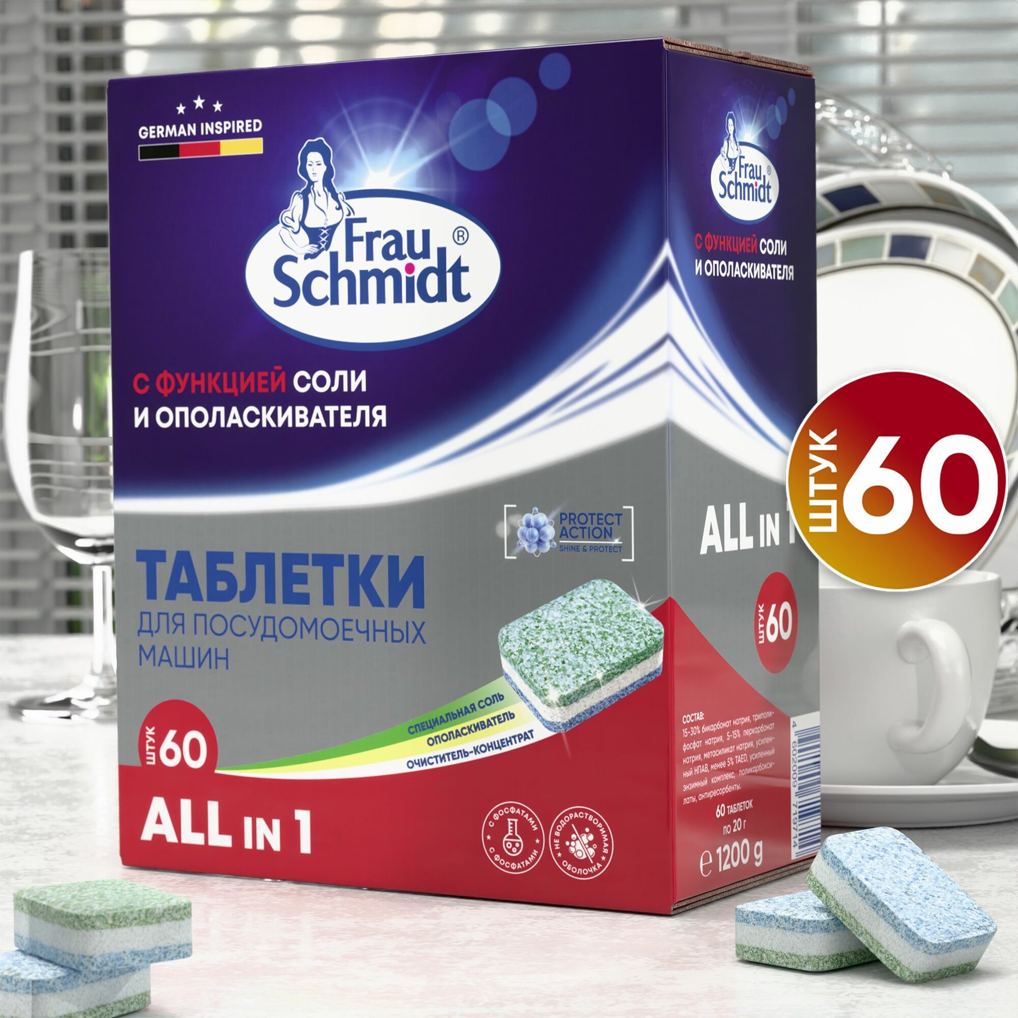 Frau Schmidt Таблетки для мытья посуды в посудомоечной машине "Все в 1" 60 таблеток
