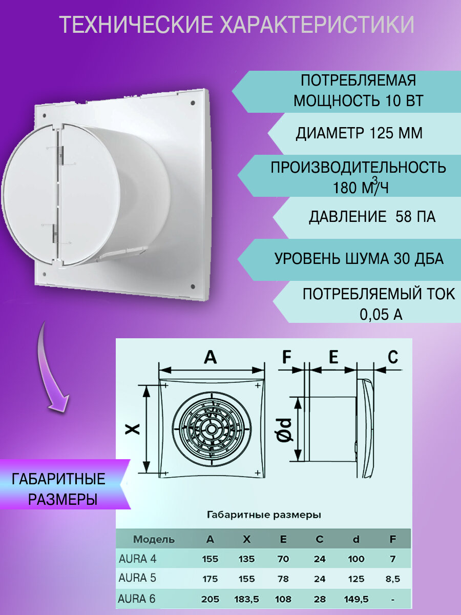 AURA 5C вентилятор вытяжной c обратным клапаном на шарикоподшипниках D125