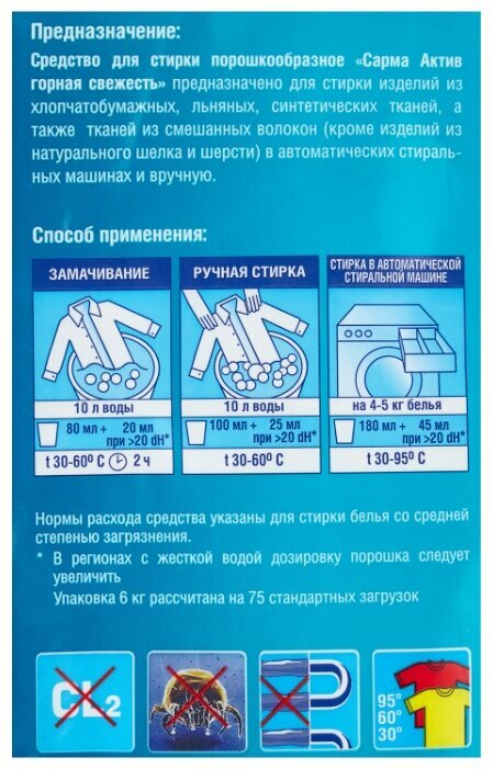 Порошок стиральный SARMA Актив для любого вида белья аромат горная свежесть для всех типов стирки 6кг / моющее средство