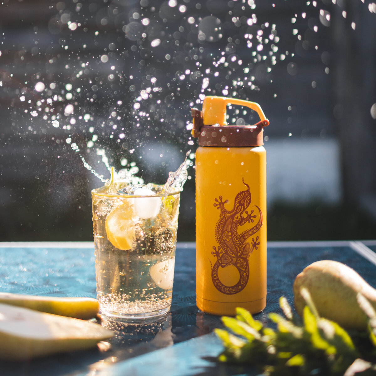 Термокружка для чая и кофе Арктика 702-500 желтый ящерица 0,5 литров термостакан для напитков питьевой с поилкой и кнопкой-фиксатором
