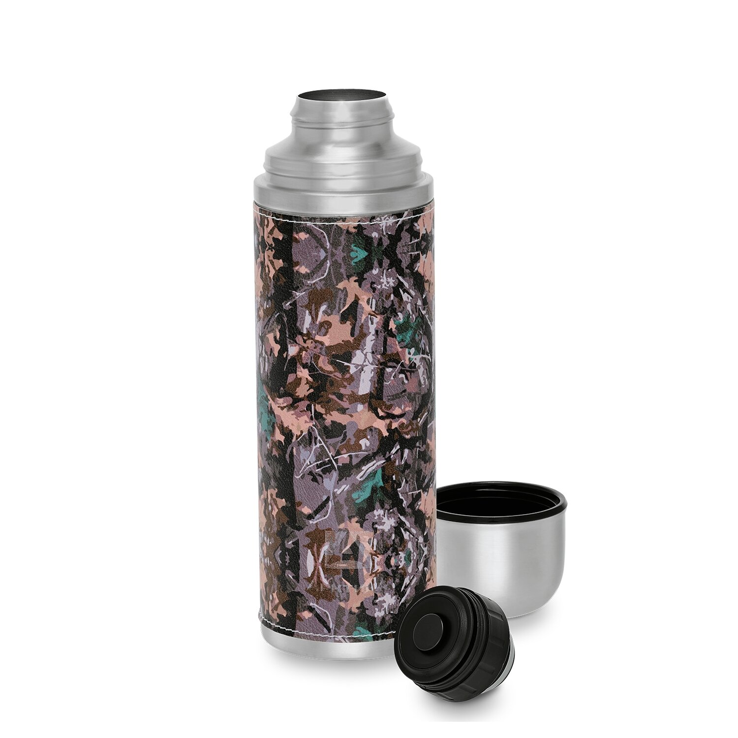 Термос для чая и кофе Арктика 108-500 милитари 0,5 литров в кожаной оплетке с кнопкой и чашкой