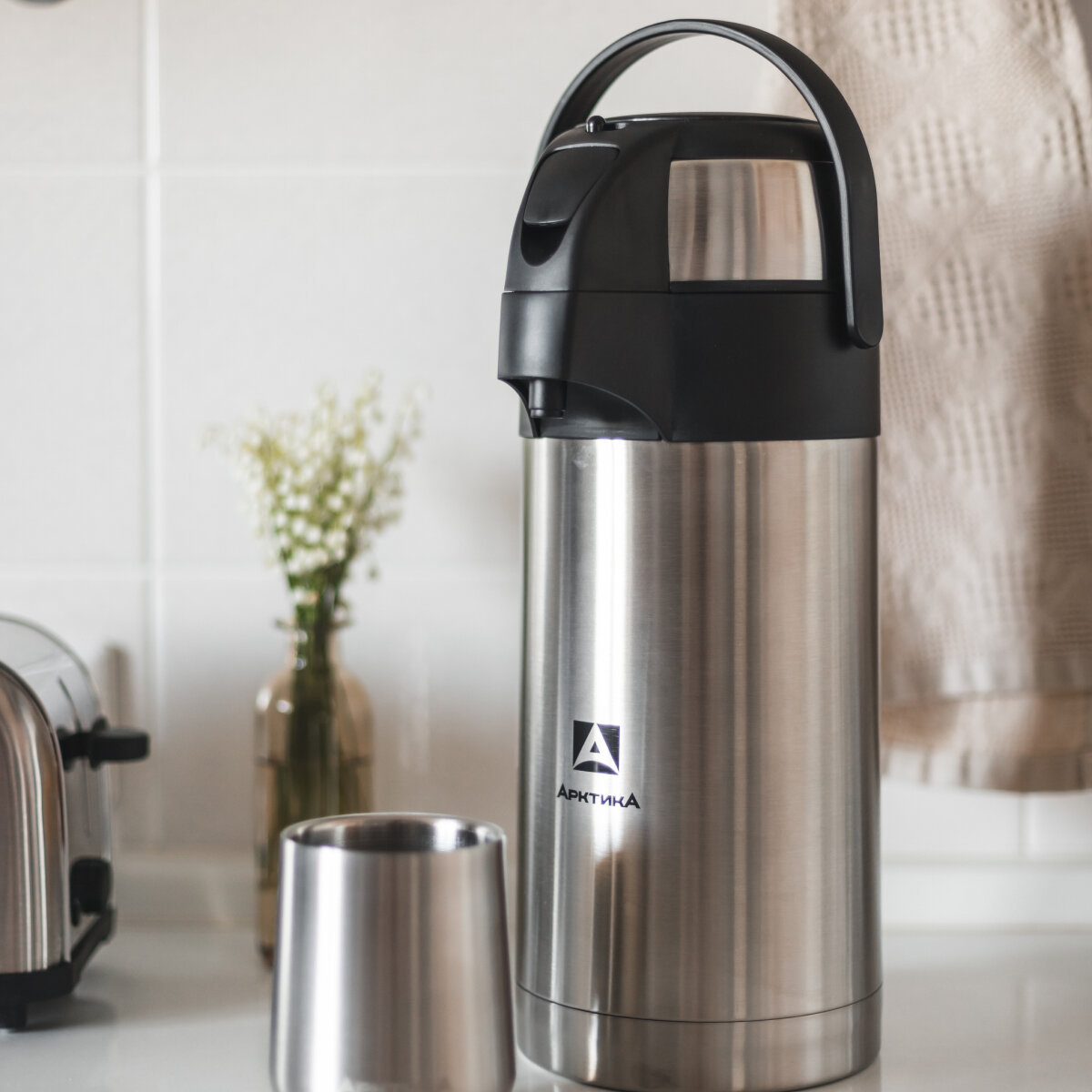 СохранитьТермос для чая и кофе с помпой Арктика 501-3000 серебристый 3 литра настольный вакуумный с пневмонасосом и ручкой для переноски интересное: