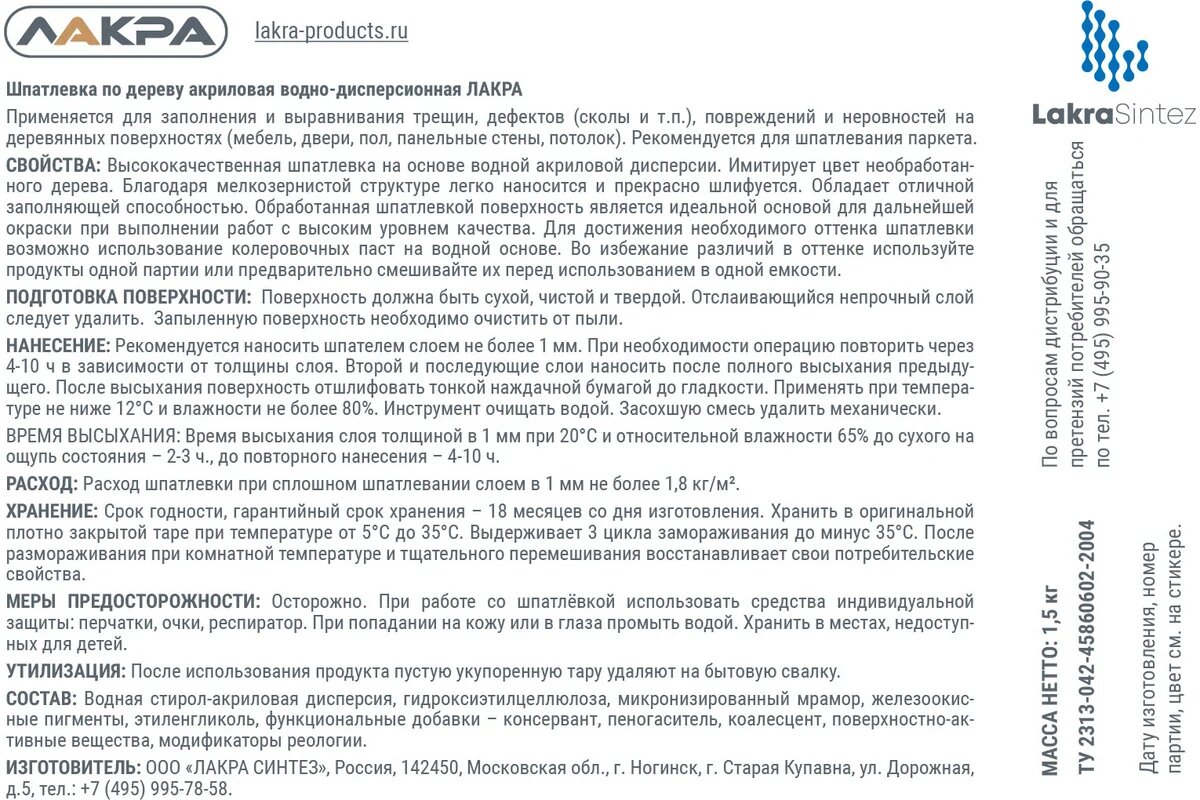 Шпатлевка по дереву 1,5 кг Лакра