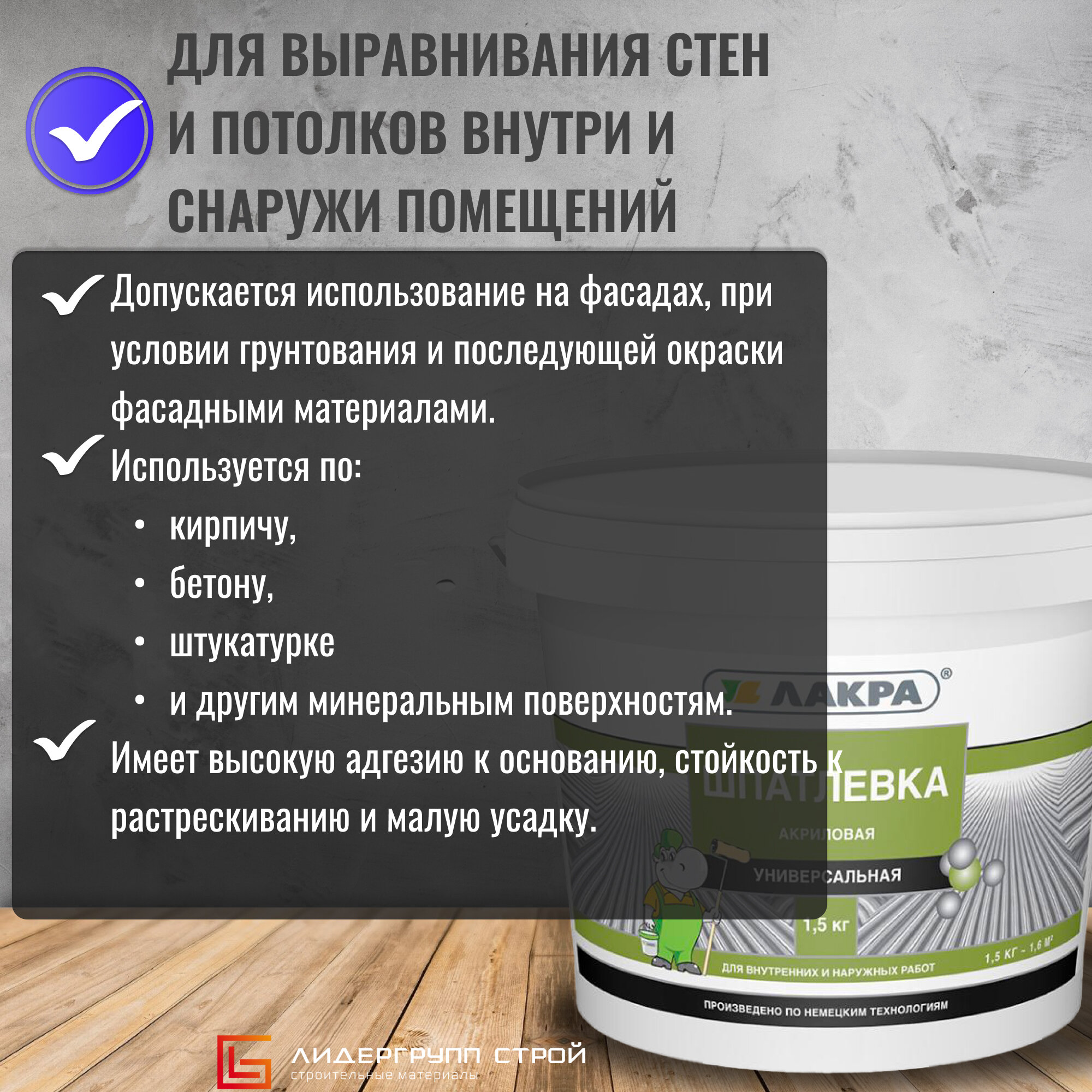 Шпатлевка акриловая универсальная для внутренних и наружных работ 1,5кг Лакра 90005285936