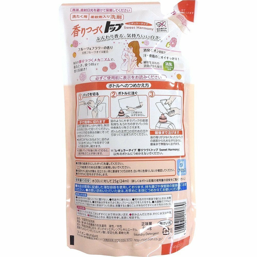 LION Жидкое средство для стирки белья "Toп" с дезодорирующим эффектом, аромат Сладкая гармония, Япония, 720 гр., (мягкая упаковка)