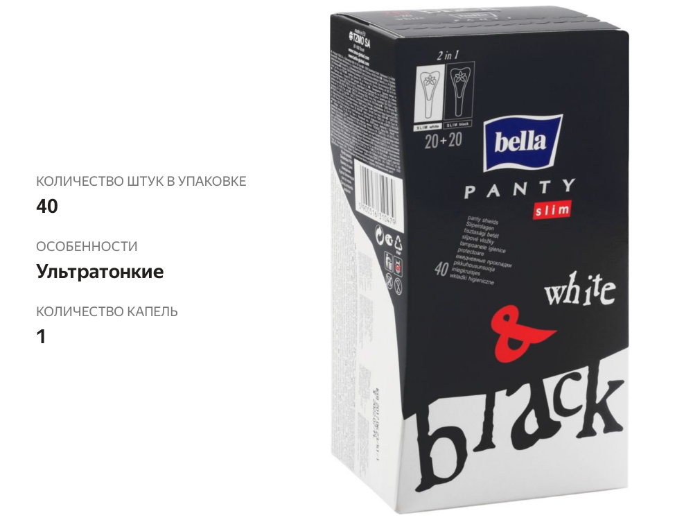 Прокладки ежедневные ультратонкие bella Panty Slim Black&White/ ежедневки для стринг, 40 шт.