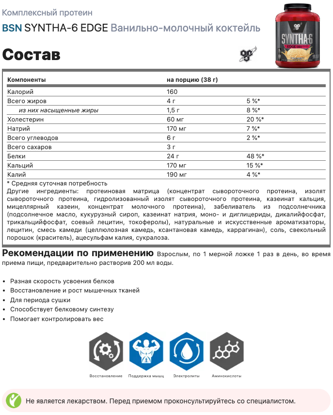 Ниже Вы можете прочитать отзывы на Комплексный протеин BSN SYNTHA-6 EDGE 1040 г, Ванильно-молочный коктейль, ознакомится с подробными характеристиками, посмотреть интересные обзоры и фотографии на Комплексный протеин BSN SYNTHA-6 EDGE 1040 г, Ванильно-молочный коктейль.