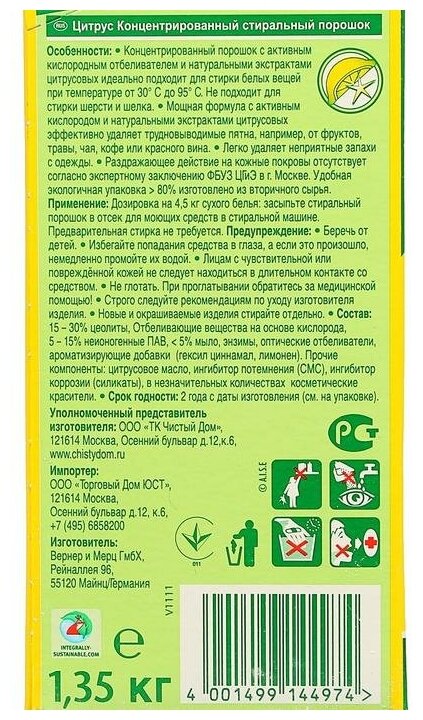 Фрош цитрус конц.стиральный порошок с отбеливателем, 1,35 кг. Картон