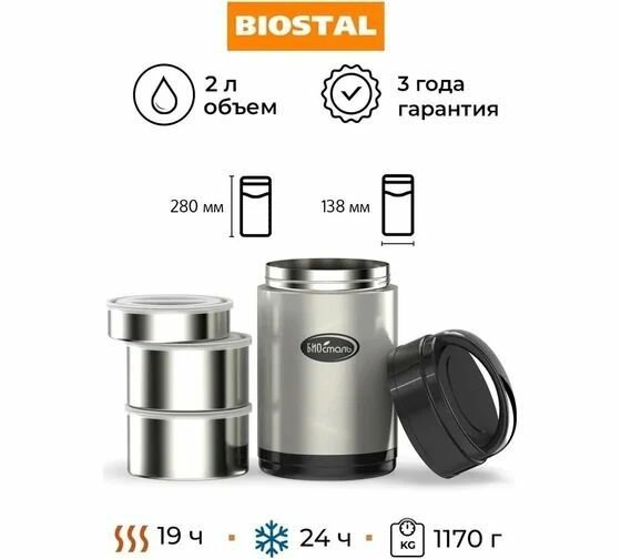 Термос для еды Biostal (1,8 литра) с 3-мя метал.контейнерами