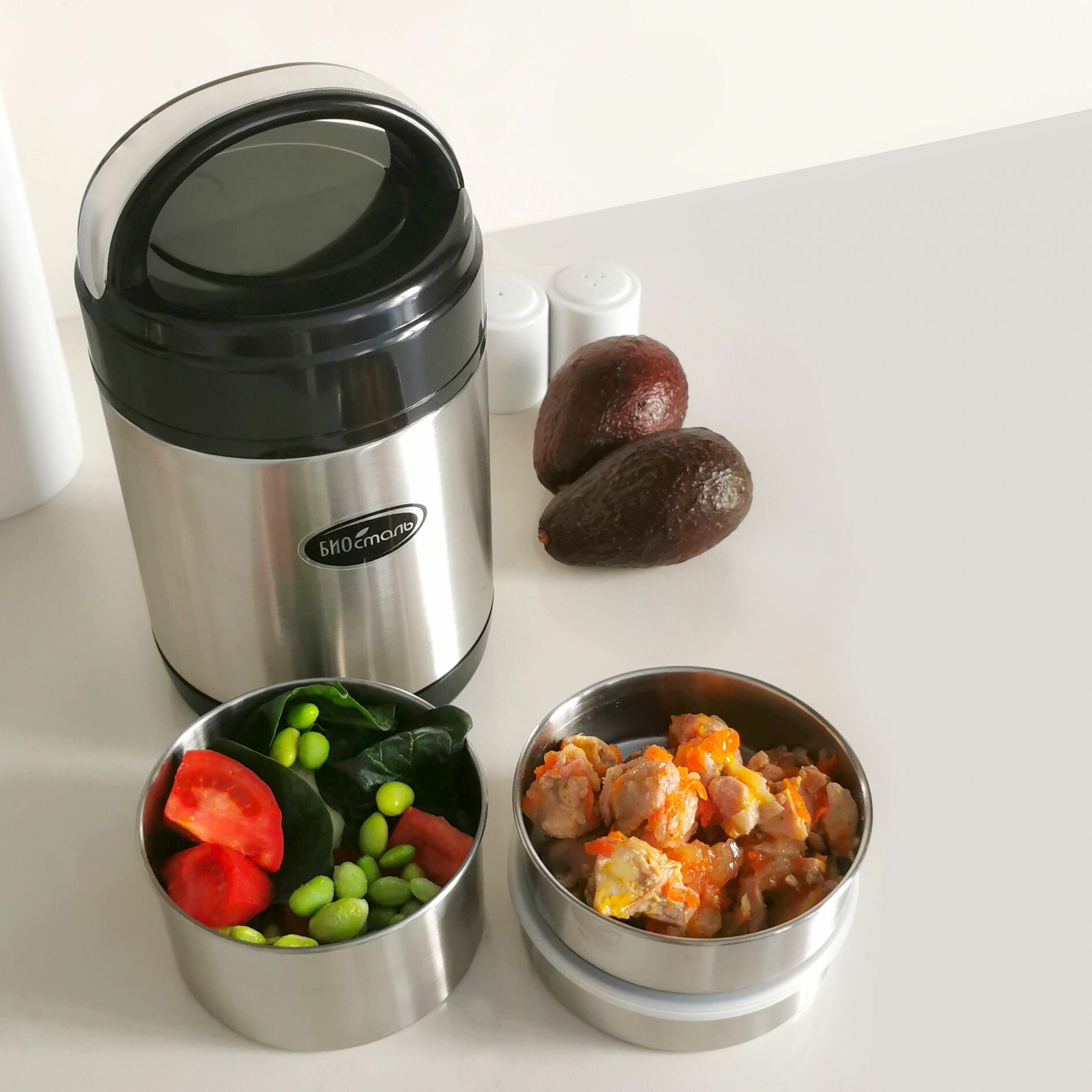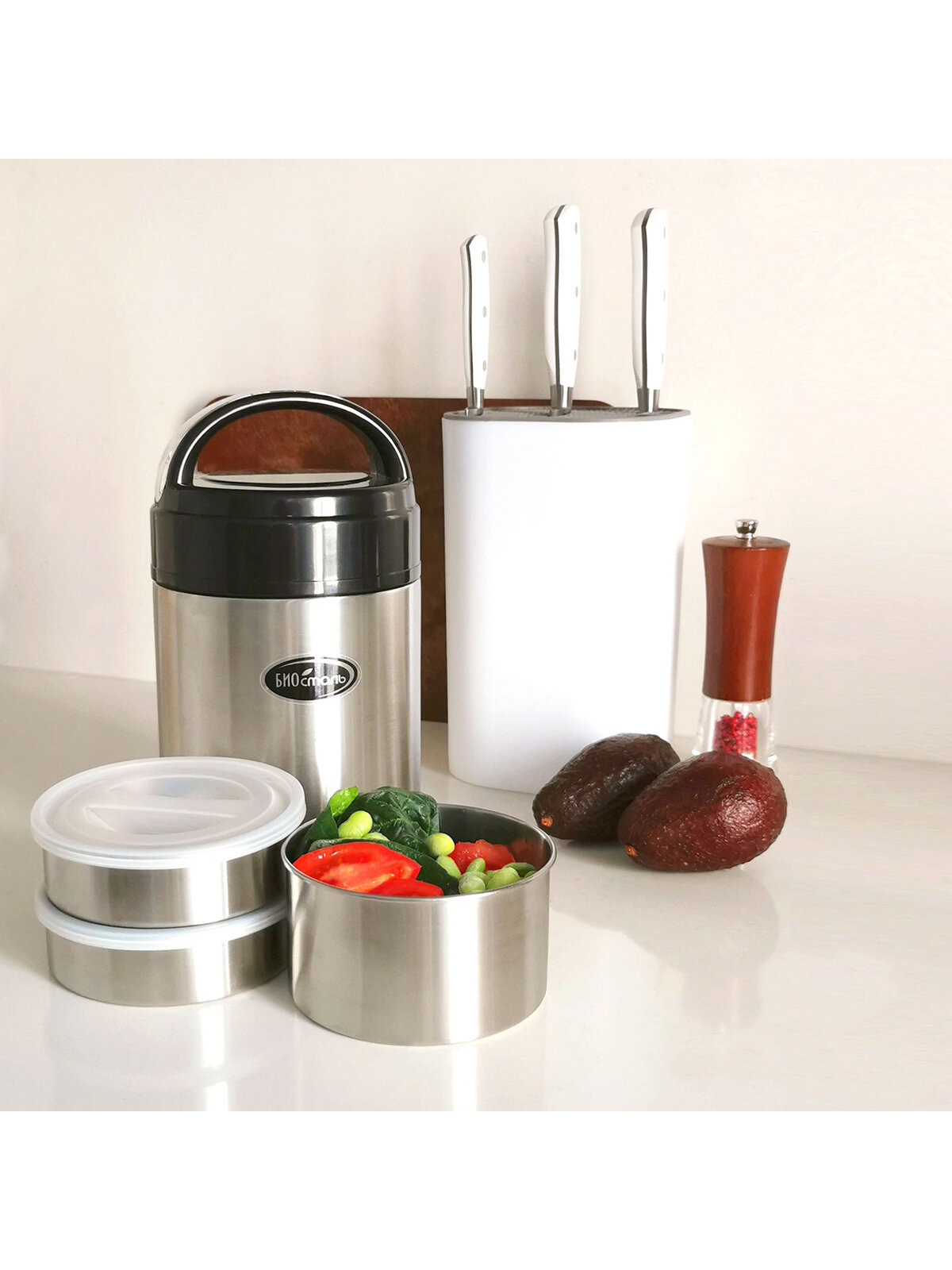 Термос для еды Biostal NR с тремя контейнерами, 1.8 л, серебристый/черный