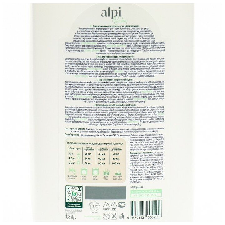 GRASS Alpi sensitive gel. Гель-концентрат для стирки детских вещей. Не содержит раздражающих компонентов. 1,8 л.