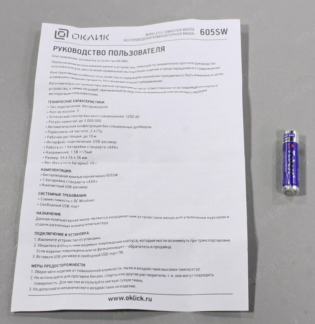 | Источник питания мыши | 1xAAA |