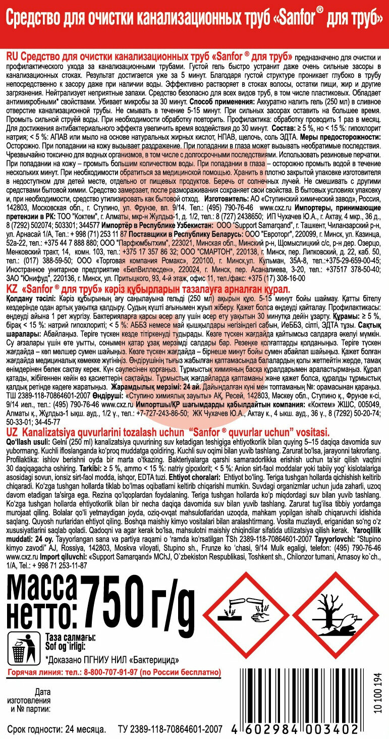 СохранитьSanfor Набор: Гель для канализационных труб 5 минут, для сложных засоров 750 мл ( 2 шт ) интересное: