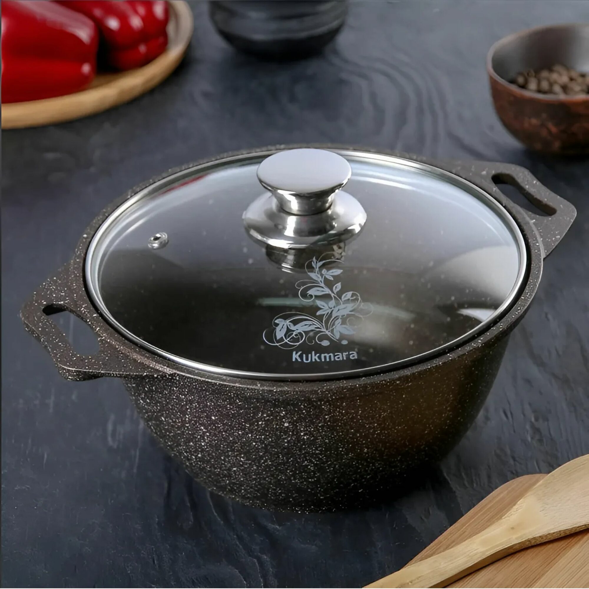 Кастрюля Kukmara "Мраморная" 3л с антипригарным покрытием (темный мрамор) со стеклянной крышкой