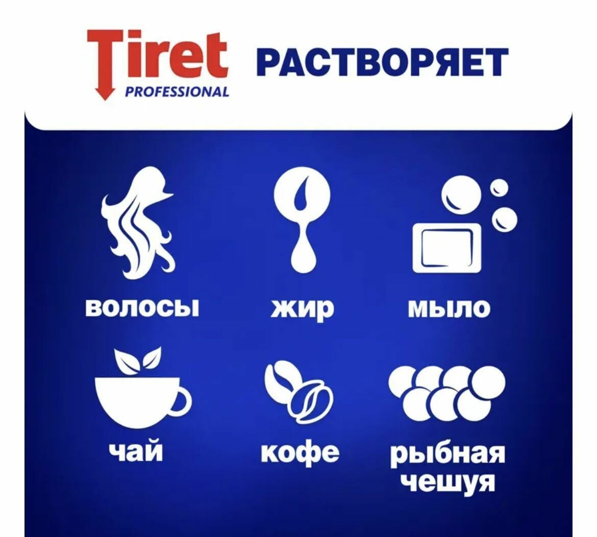 | Отзыв: | Чтобы реклама соотаетствовала истине, что средство финальное и круче нет, следует к флакону приложить проволочку с крючком на конце, для первичной прочистки от клочьев волос. А потом заливать Tiret, который эти волосы почти не уничтожает. |
