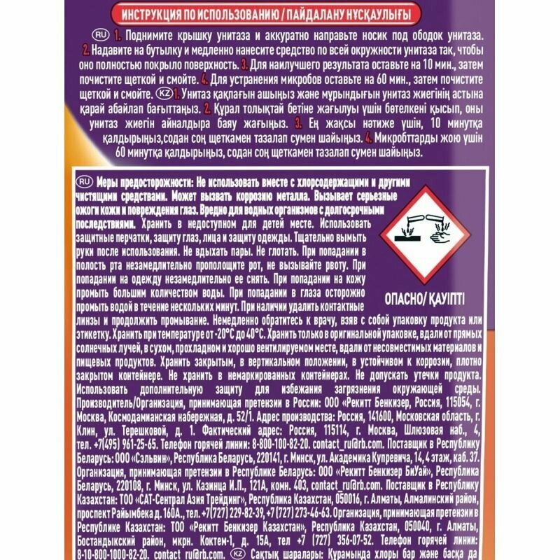 | Плюсы: | Хорошо справляется с задачей, нет химозного запаха как от доместоса |