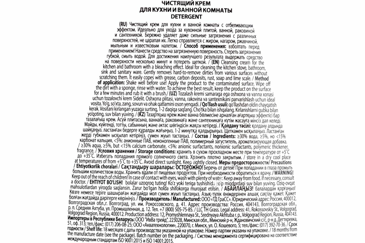 Купить Крем чистящий универсальный для ванной и кухни 500 мл, GRASS AZELIT, отбеливающий, 125759