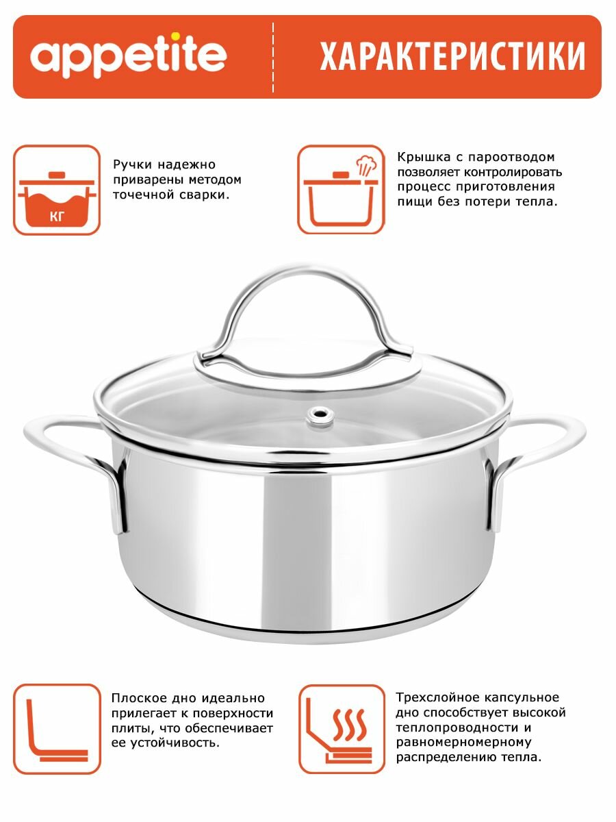 Кастрюля из нержавеющей стали "Pretty" 2,7л, д18см, h10,5см, стеклянная крышка, двойное капсулированное дно, подарочная коробка, Appetite (Китай)