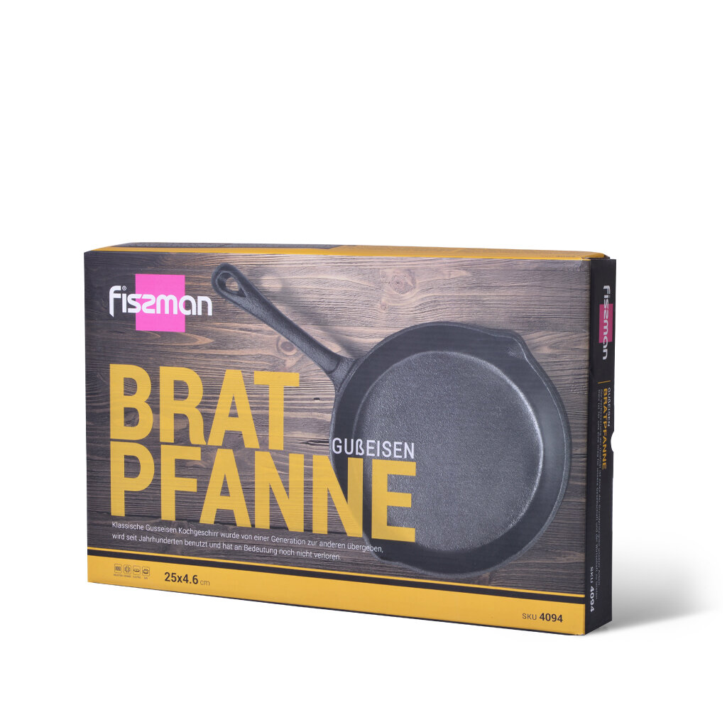 4094 FISSMAN Сковорода для жарки 25x4,6см (чугун) Ручка-чугун; Со сливом; Индукция