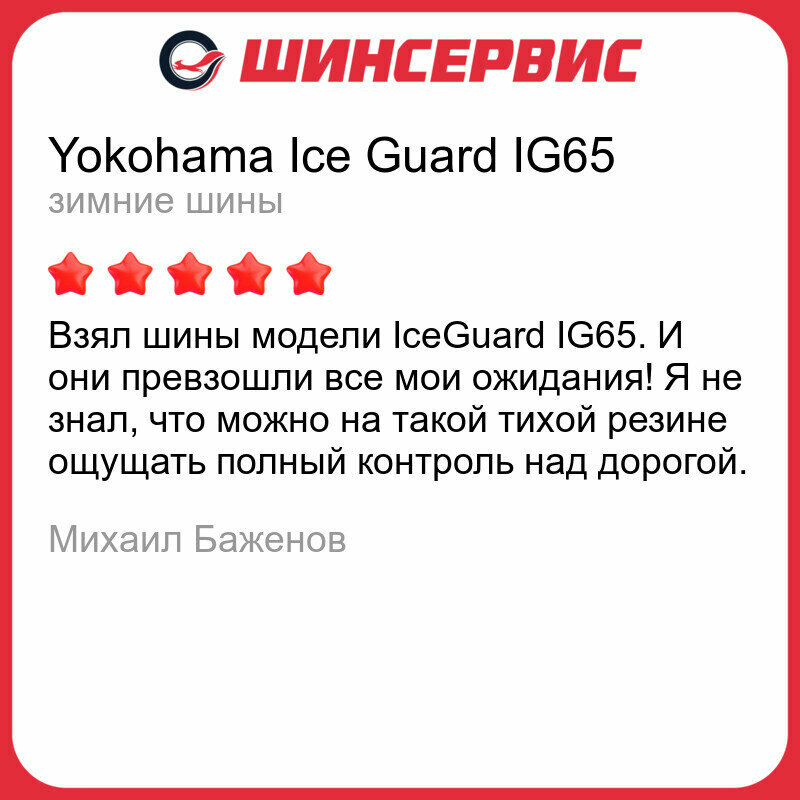| Отзыв: | Поставил шину в ноябре 2018, на замену изношенной IG35. После эксплуатации IG35 было очень негативное отношение к зимней шине от Yokohama. До этого катался только на Hakkapelia разных модификаций. Последние были Nordman. Шипы вылетали как молочные зубы. Пересмотрел много шин. Выбор пал на Pirelli Ice Zero, Yokohama IG 65, ну и/или совсем какой-нибудь Китай. В магазине знакомый убедил, что нужно довериться Yokohama IG 65.