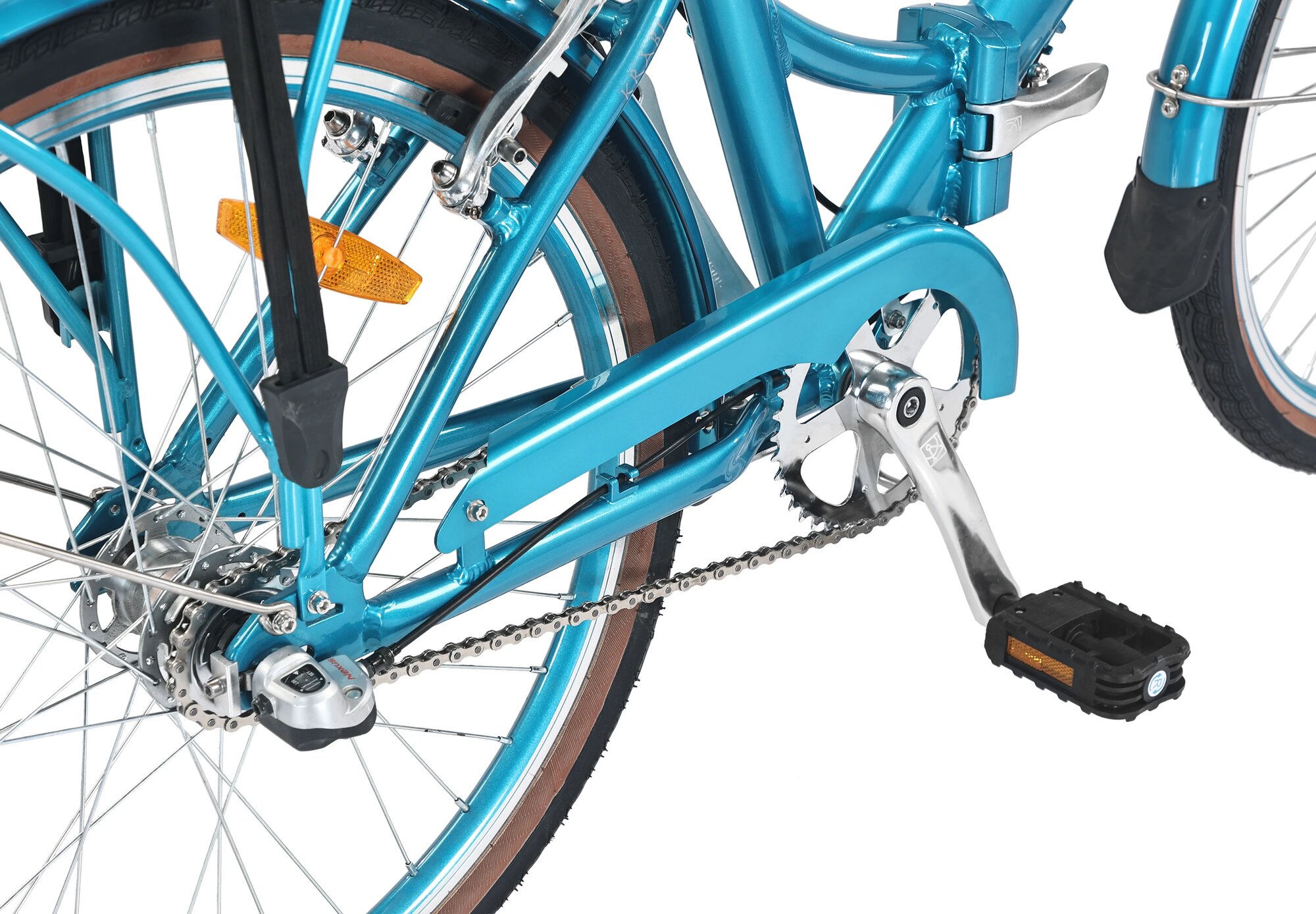 – Оптимальные, но не маленькие колёса (24") – Большое удобное седло – Крепкие педали (которые можно также сложить при хранении) – Очень хороший ход, комфортная езда – 3 скорости – оптимально, чтобы без проблем передвигаться по городу – Багажник сзади |