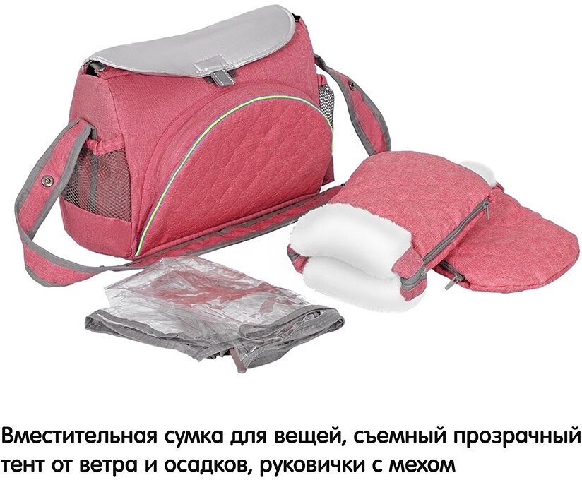 Ребёнок защищён от ветра, осадков, холода. Удобная педаль для переключения между полозьями санок и колёсами. В комплекте идёт небольшой дождевик (закрывает ребёнка от попадания в лицо осадков), мягкая игрушка в подарок